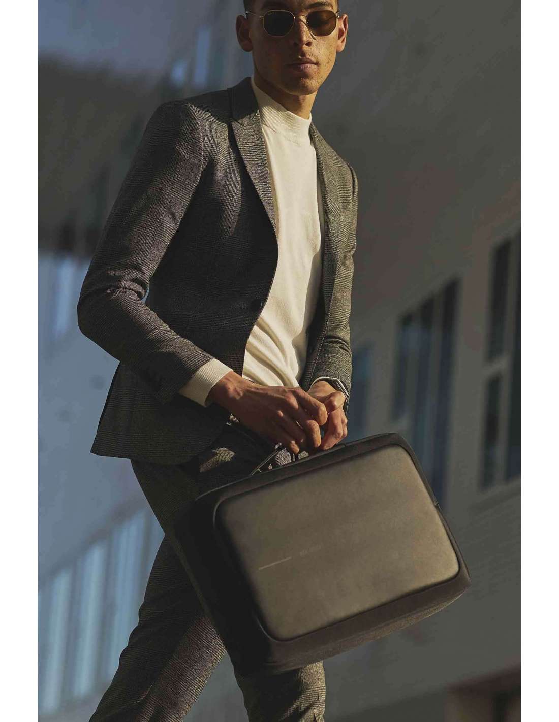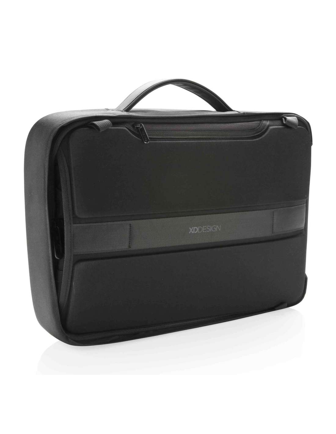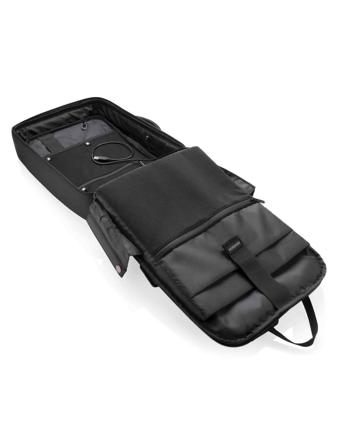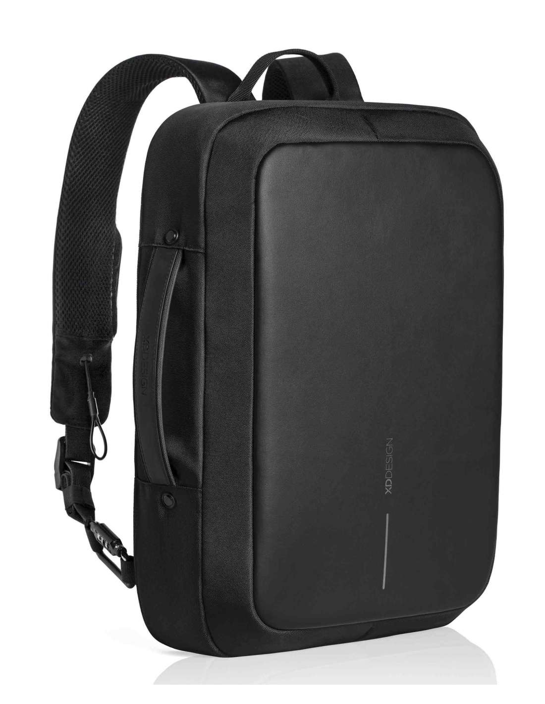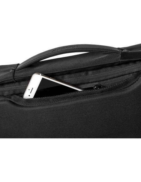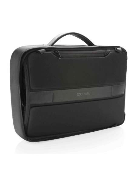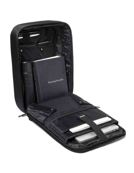 Compartiment encoixinat per a tauleta de fins a 12.9". Compartiment encoixinat per a portàtil de fins a 15.6". Ports integrats de càrrega USB. Cremalleres ocultes i butxaques protegides amb RFID. Material resistent al tall. Sense accés frontal. Teixit repel·lent a l'aigua. Funció dual: motxilla o maletí. Pany d'aliatge de zinc integrat.