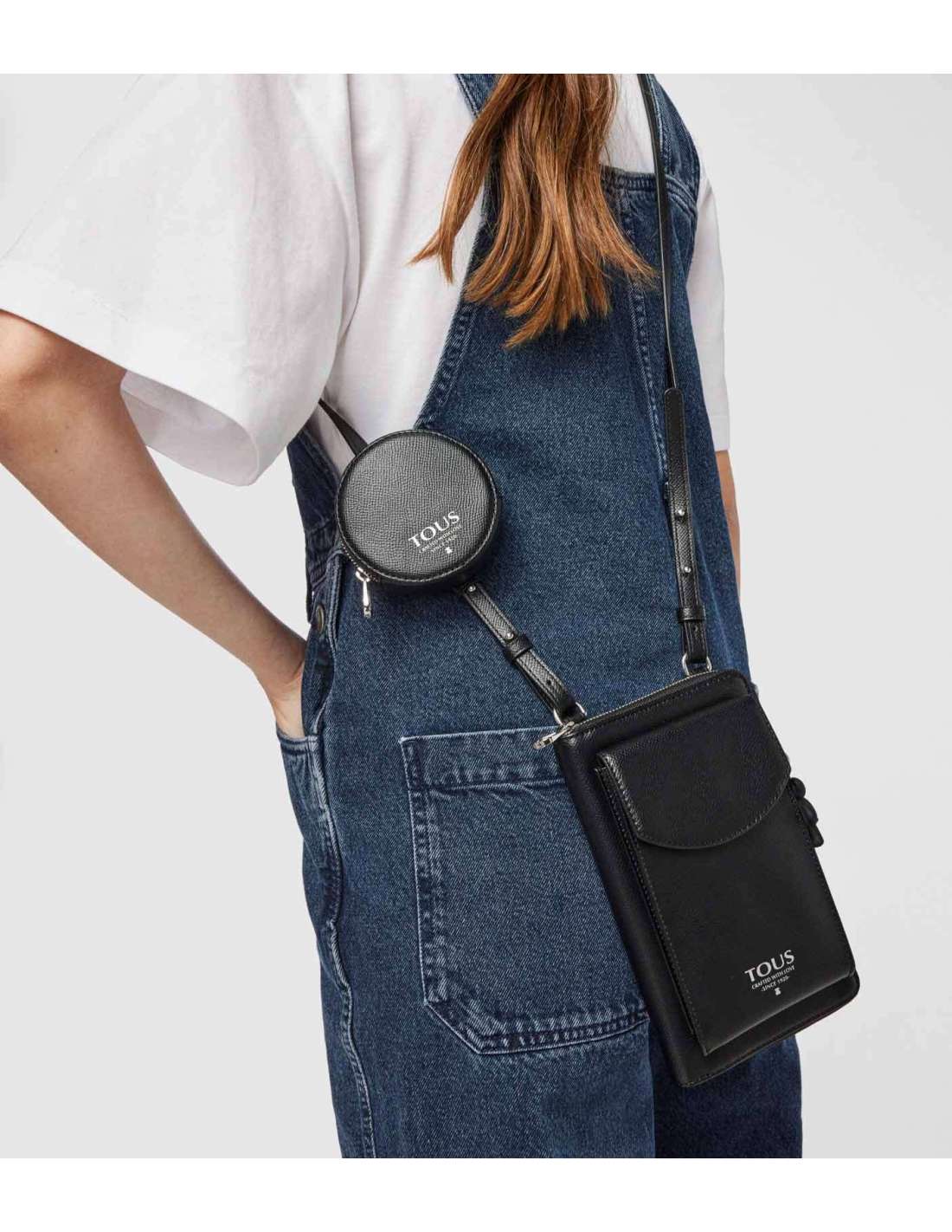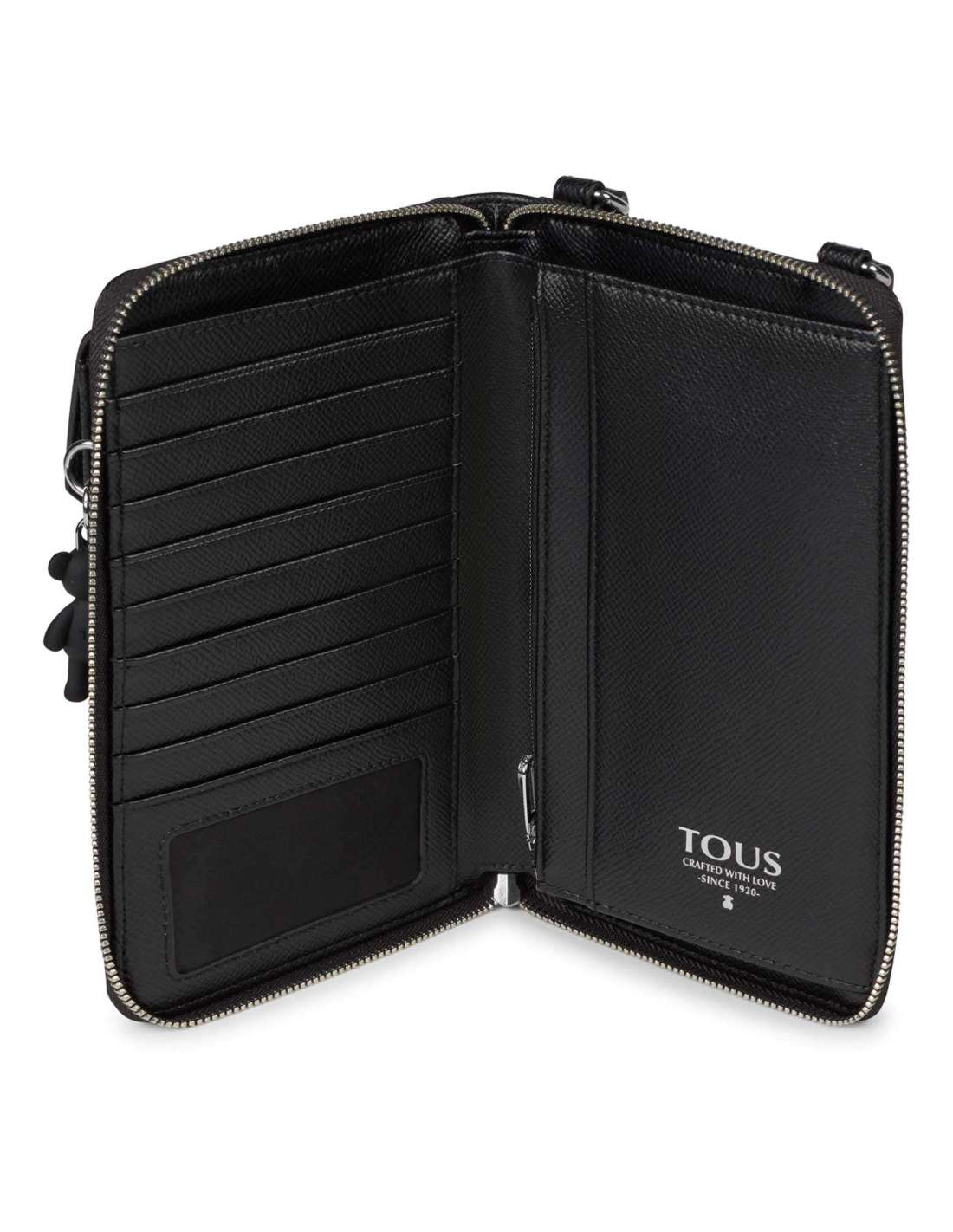 Funda mòbil i cartera penjant TOUS de la col·lecció T POP de poliuretà amb efecte pell. Tancament amb cremallera i solapa. Nansa de bandolera. La part de cartera inclou compartiments per a targetes i una butxaca de cremallera.