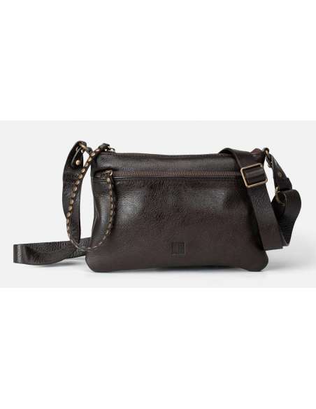 Bossa petita de pell vacuna natural. Bandolera ajustable i extraïble. Tira de pell natural amb tatxes que tanca i obre la cremallera de la butxaca del davant com la de la bossa. Butxaca amb cremallera al dors. Folre en sarja de cotó. Múltiples butxaques a l'interior.
