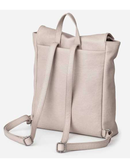 Motxilla efecte pell. Butxaca del darrere amb cremallera. Nansa de mà i corretges regulables. Folre interior de cotó amb múltiples butxaques. Tancament amb solapa i cremallera metàl·lica.
