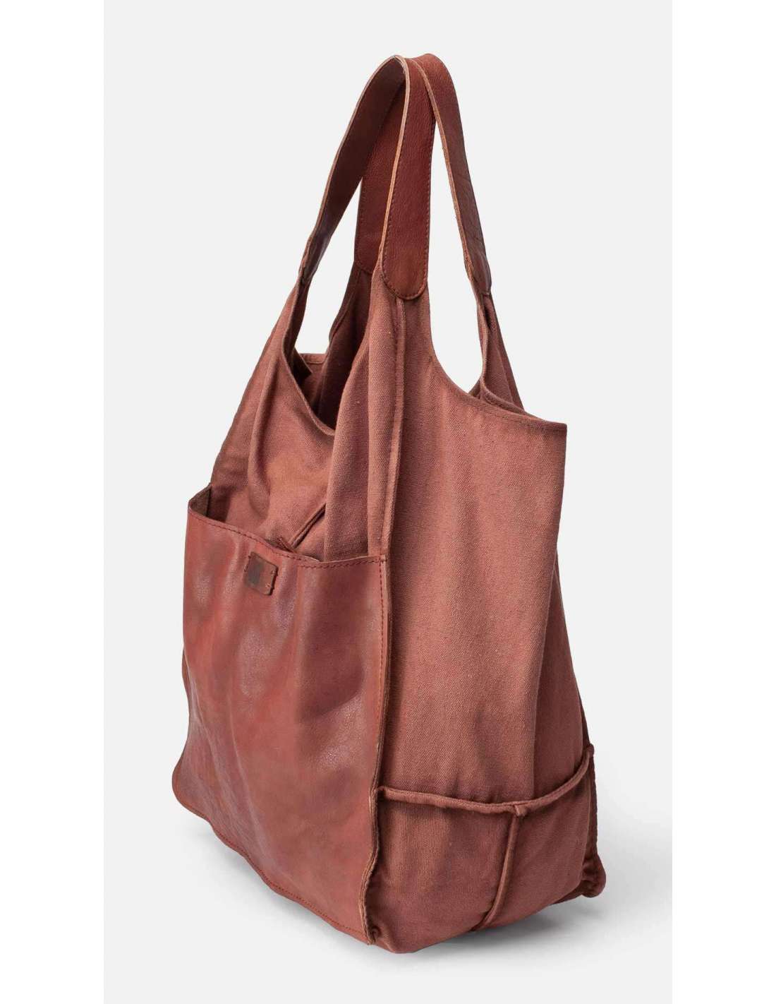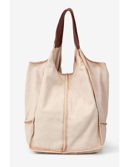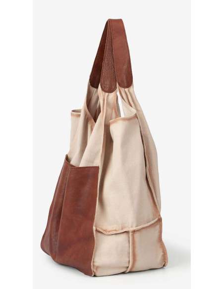 Shopper gran combinat amb cotó rentat i pell de bufal. Butxaques internes i externes i tancament amb botó.