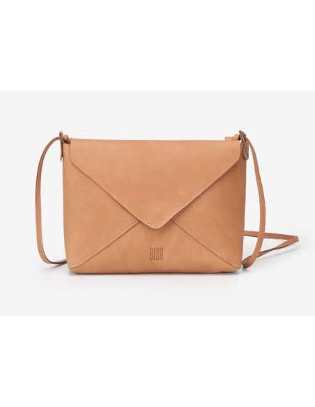 Cross bag de pell bovina en format sobre. Tancament amb botó. Bandolera ajustable amb nus, butxaca interna i sense folre intern.
