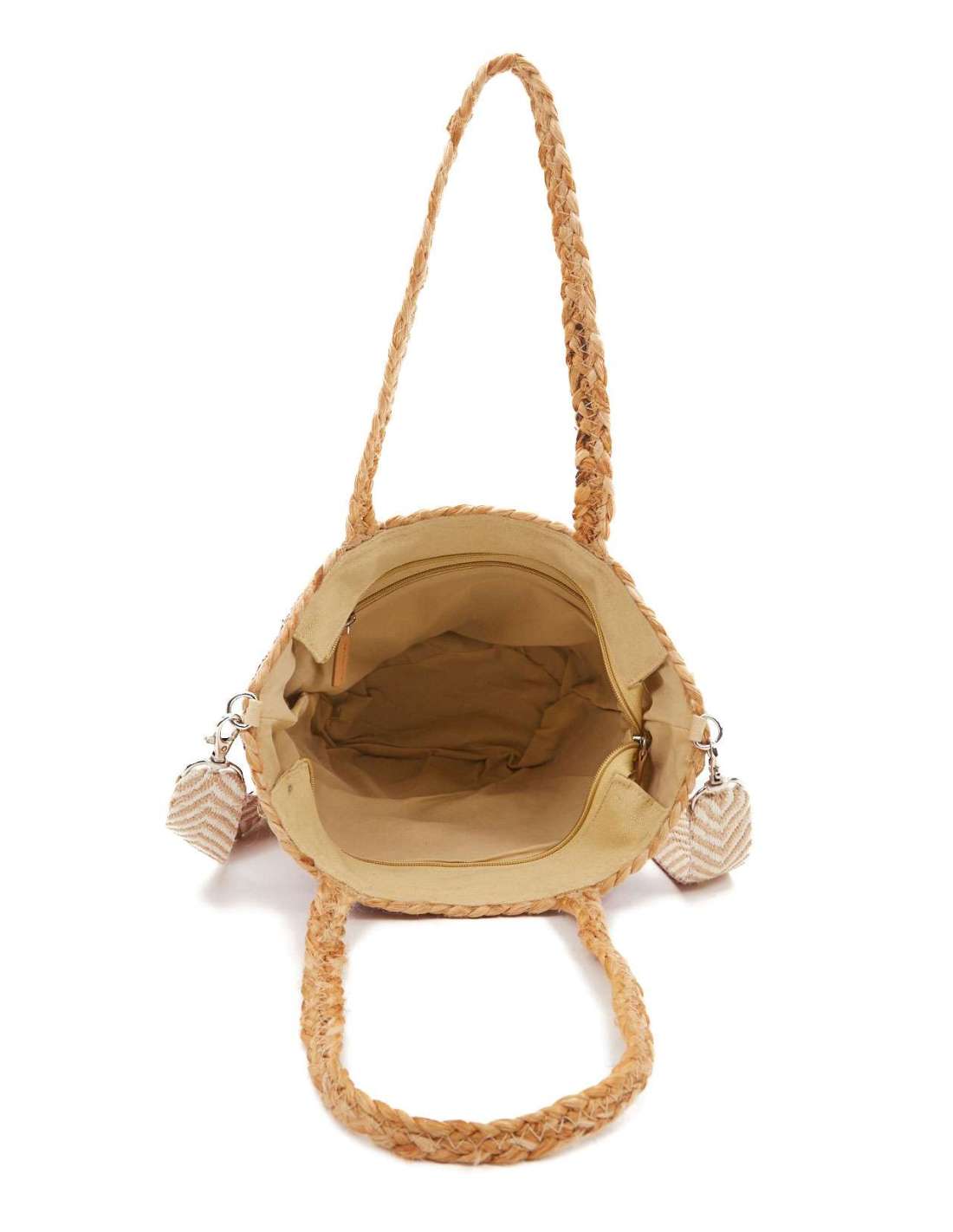 Combina la doble nansa d'espatlla amb una pràctica bandolera que es pot regular i és de posar i treure. Cal recordar que, com que és un model elaborat de forma manual amb tècniques artesanes de trenat de ràfia, cada bossa és única i pot presentar diferents característiques.