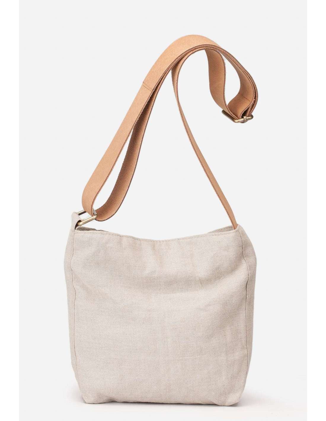 Cross bag de lli, bandolera de pell regulable i butxaques internes. Tancament amb cremallera i folre de cotó.