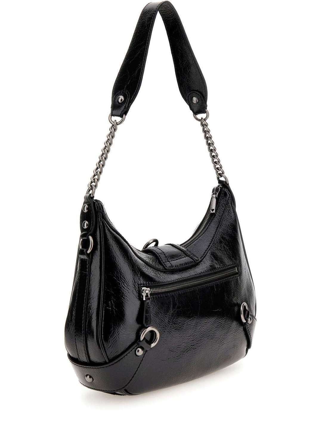 Exterior de pell sintètica. Tancament amb cremallera. Peces metàl·liques color platejat.