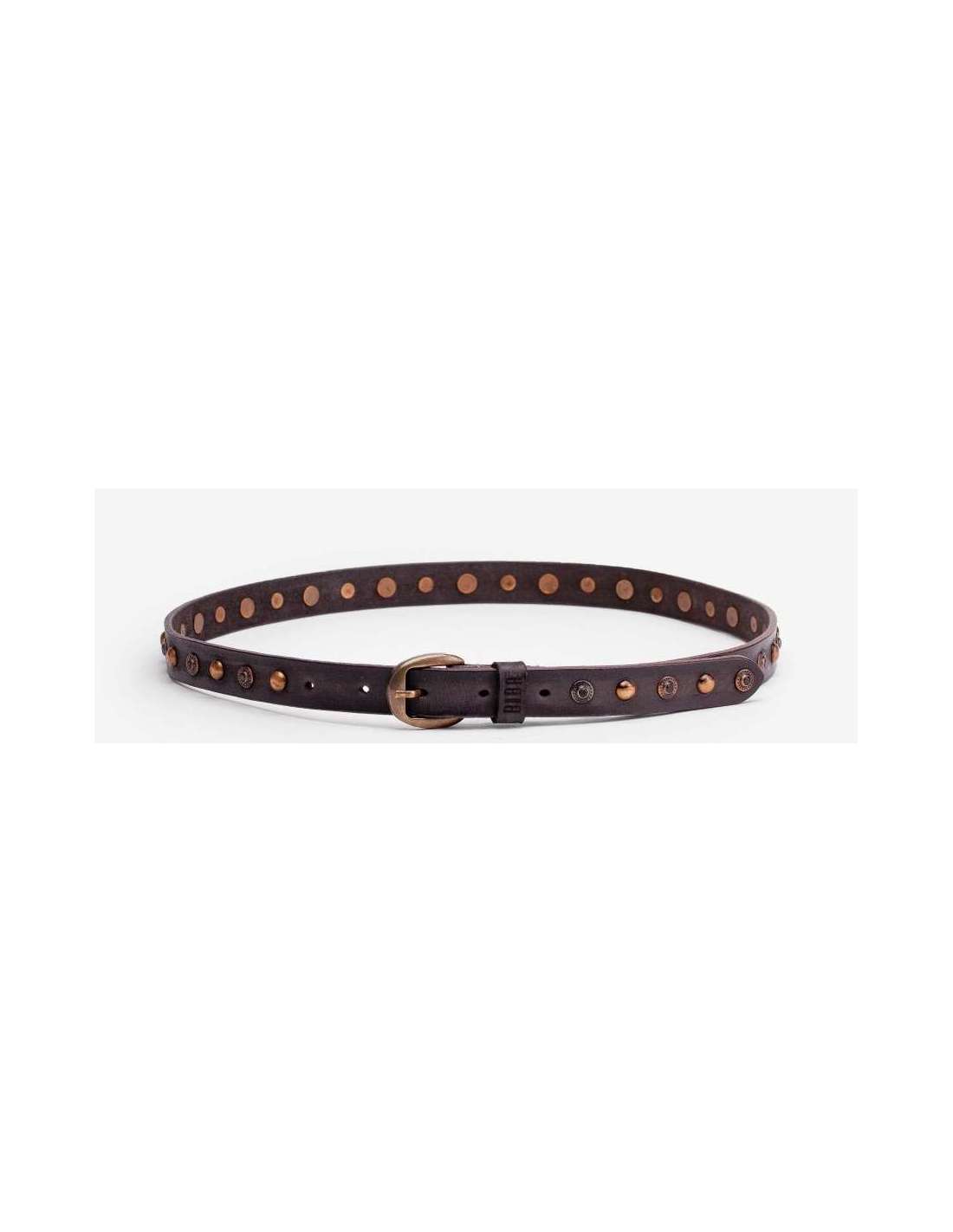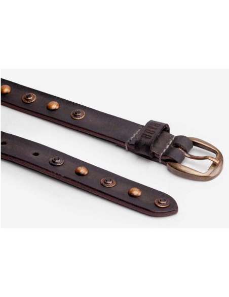 Cinturó de pell vacuna. Cargol posterior per tallar-lo manualment. Ratlles a tot el cinturó. Sivella color or vell.