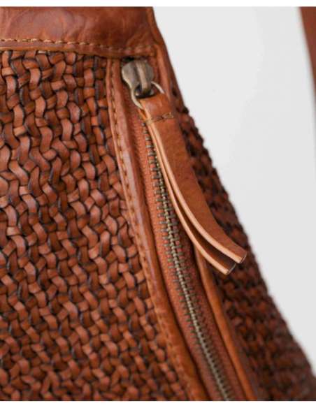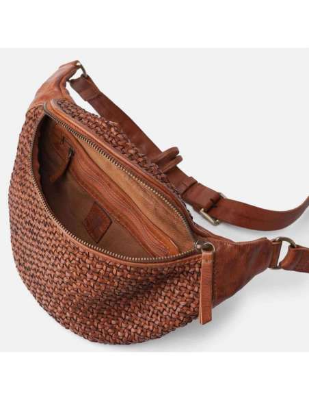 Ronyonera de pell rentada de curtició vegetal i trenada a mà. Bandolera regulable, tancament de cremallera, butxaca interna. Ronyonera parcialment forrada.