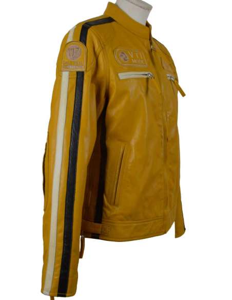 Caçadora de cuir natural tipus motard. Pegats al to a la part davantera i màniga. Línies laterals de color blanc i negre. Tancada amb cremallera. Coll mao. Butxaques laterals. Cremallera i tira lateral per entallar més. Folre fi. Llarg de la peça 58 cm (talla M).