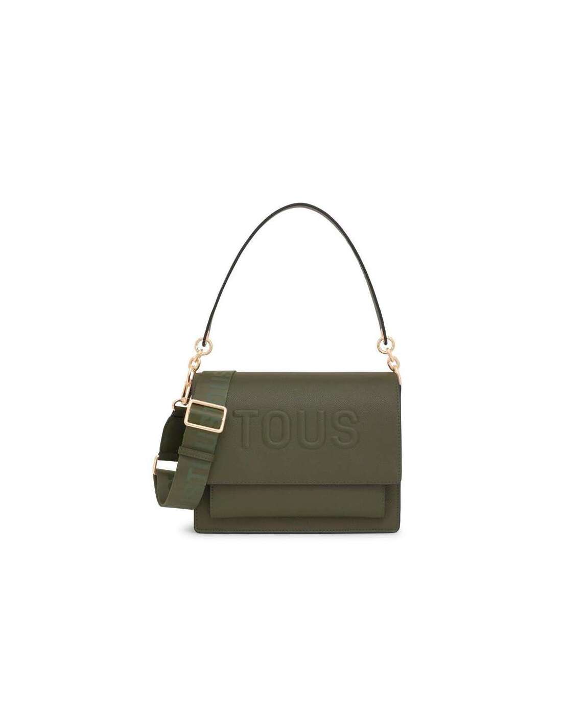 Bossa bandolera mitjana Audree TOUS Brenda de poliuretà. Incorpora una solapa i tanca amb dos botons magnètics. Compte amb dos compartiments separats per un amb cremallera i una butxaca oberta a la part davantera. Nansa d'espatlla fixa i nansa bandolera ajustable i extraïble.