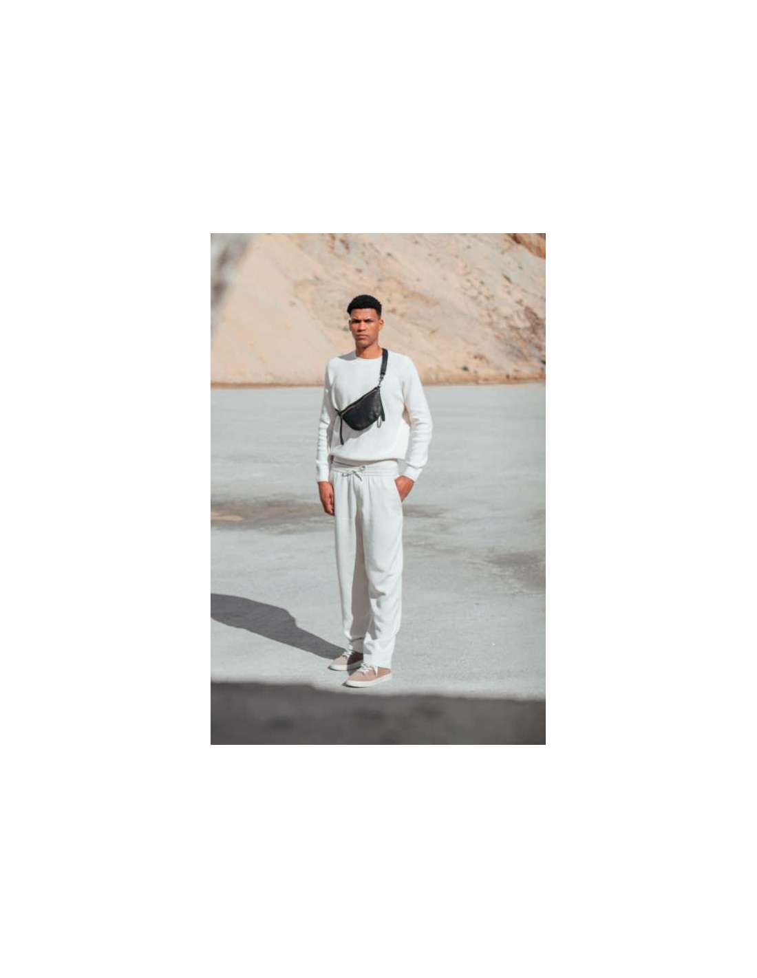 Ronyonera de pell de boví rentada. És reversible, trenada per un costat i llisa per l'altre. Tancament amb cremallera, bandolera regulable i folre de cotó.