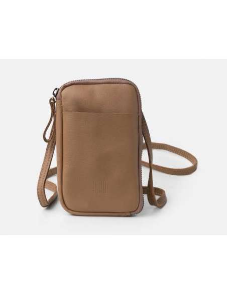 Funda pel mòbil de pell vacuna. Butxaca externa, i compartiment per al mòbil que tanca amb cremallera.