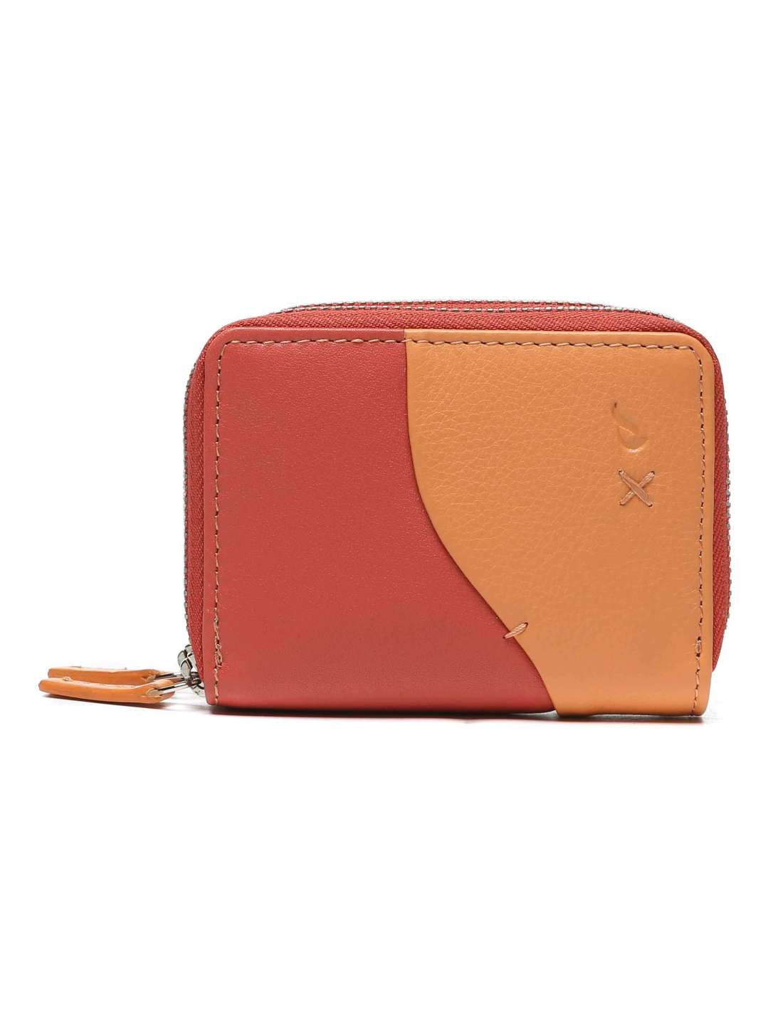 Cartera petita de dona en format acordió elaborada amb pell que combina diverses tonalitats de color. Un model en què destaca una tira de pell corba en un to més fosc que travessa la part frontal de la cartera, afegint-hi un toc de contrast i originalitat al disseny.