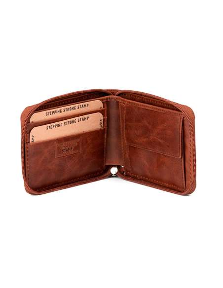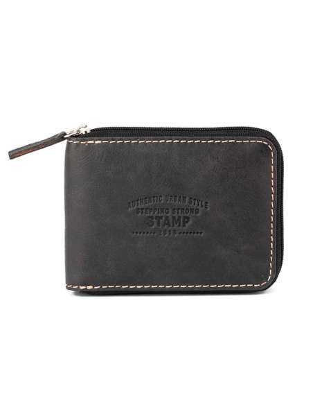 Bitlleter americà Stamp fabricat en pell boví de primera qualitat amb cremallera perimetral. L´interior té capacitat per a 10 targetes, un portamonedes amb solapa i un apartat per a bitllets. Logo de Stamp gravat a foc. Col·lecció West.