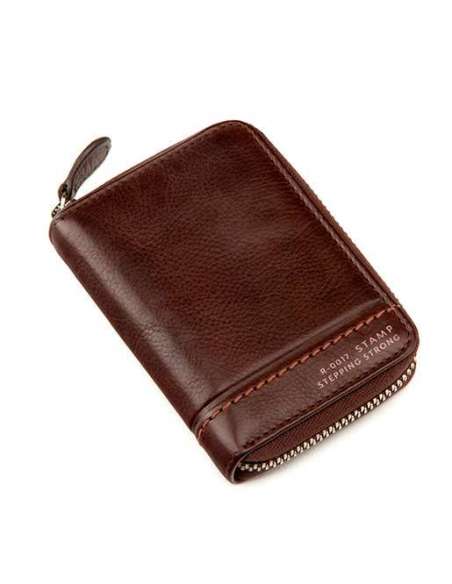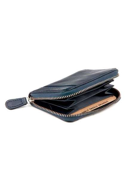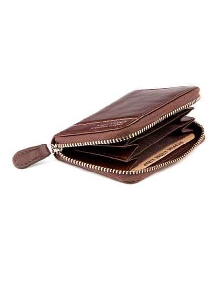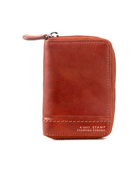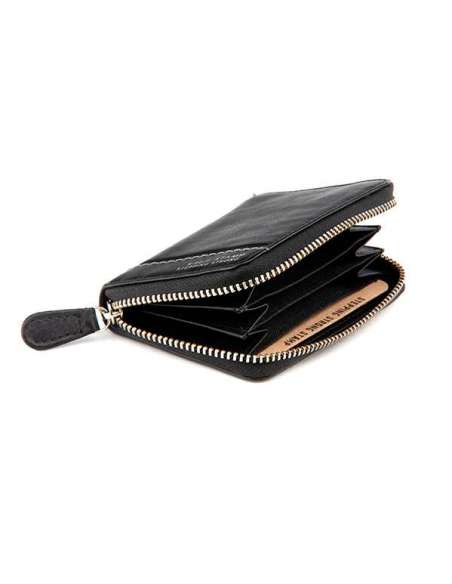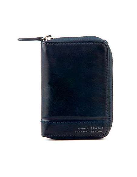 Portamonedes complet fabricat en pell rentada. Tancament perimetral amb cremallera metàl·lica. Al seu interior hi ha diversos departaments tant per a monedes com per a targetes. Logo de stamp serigrafiat.