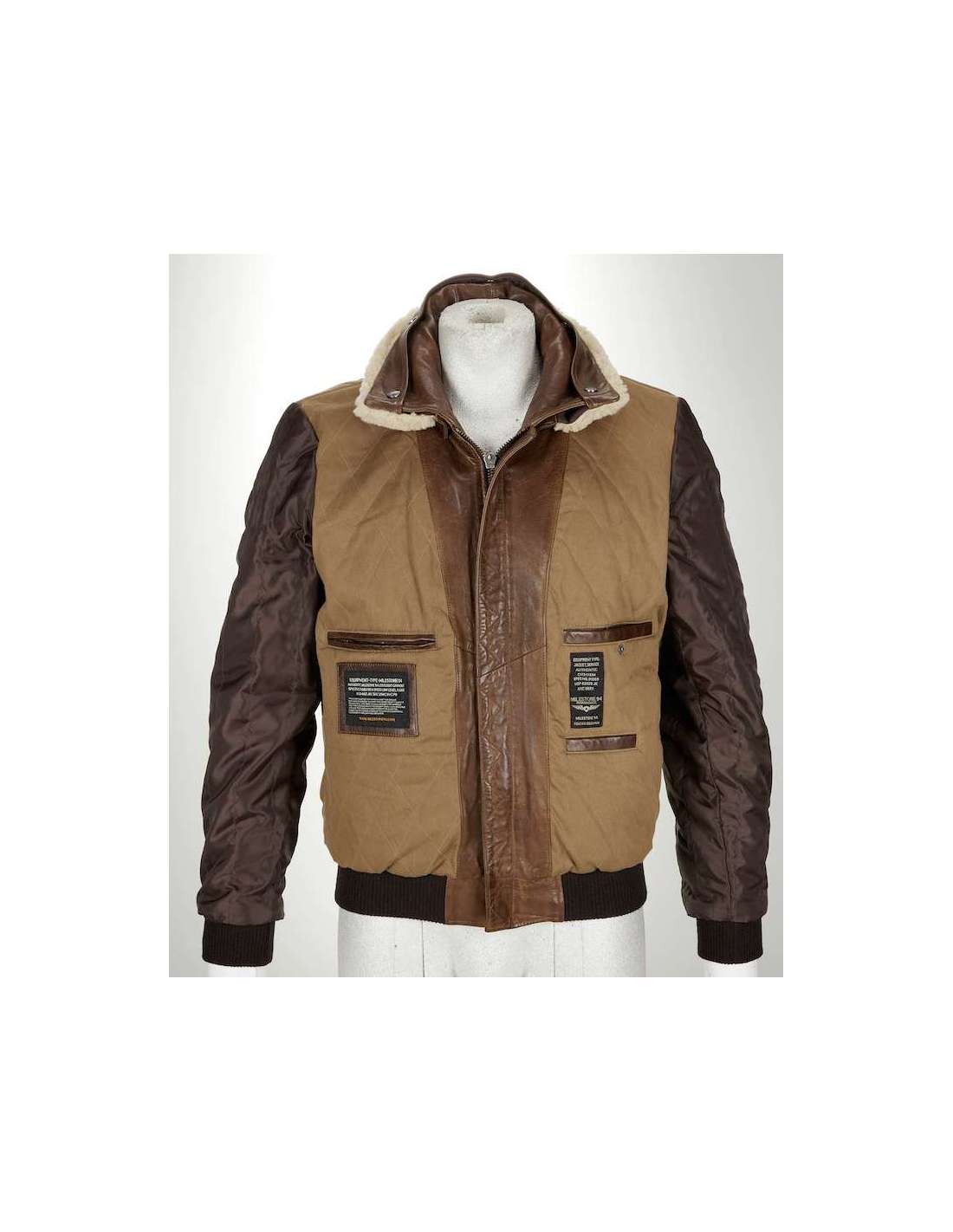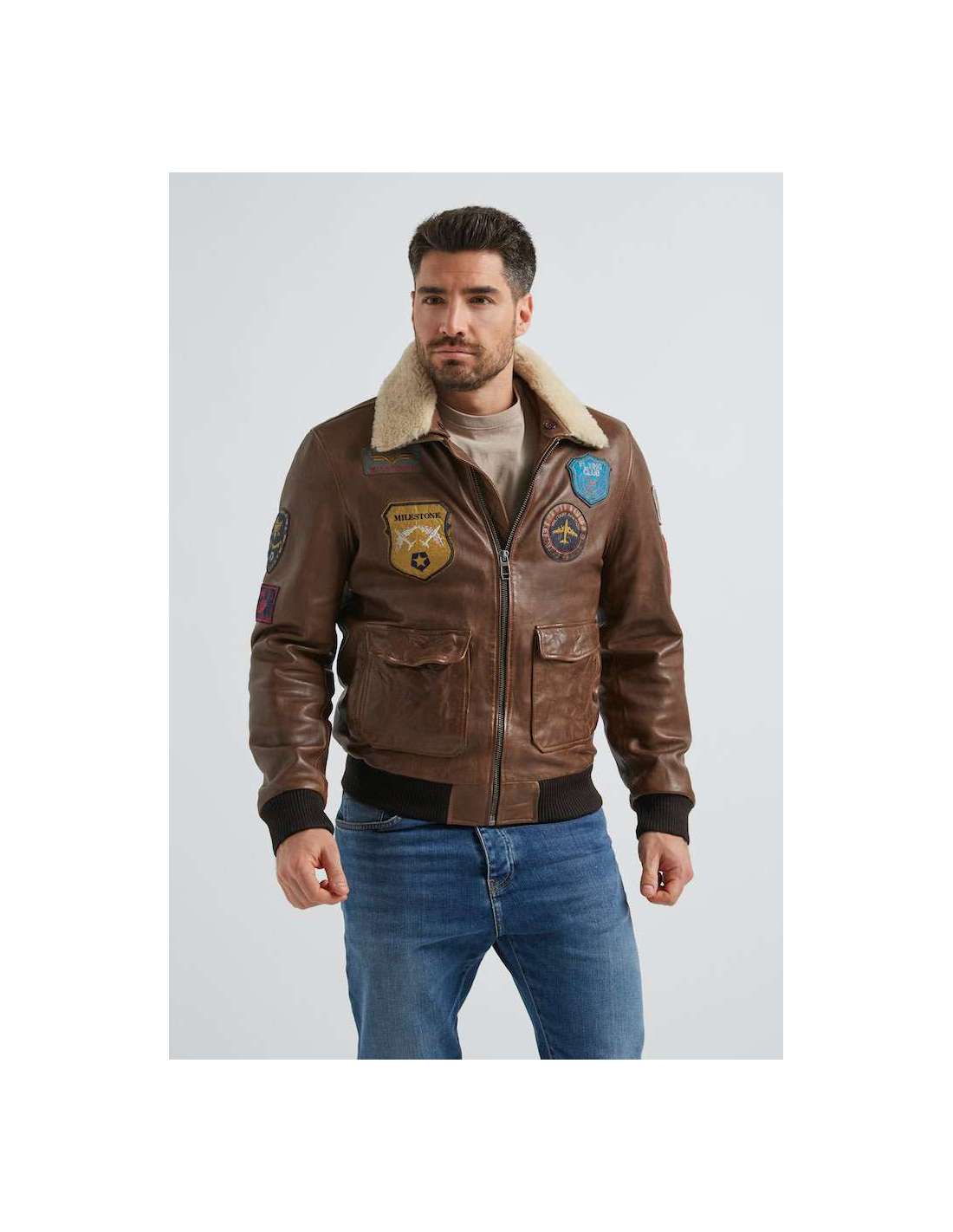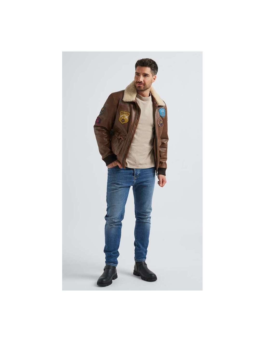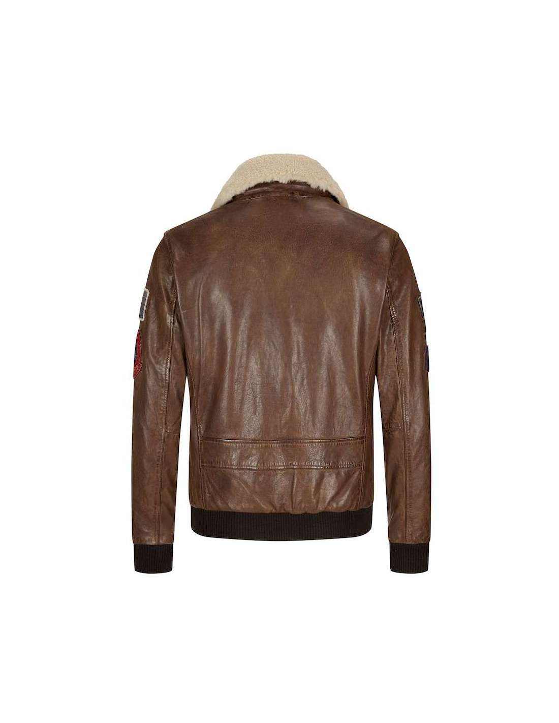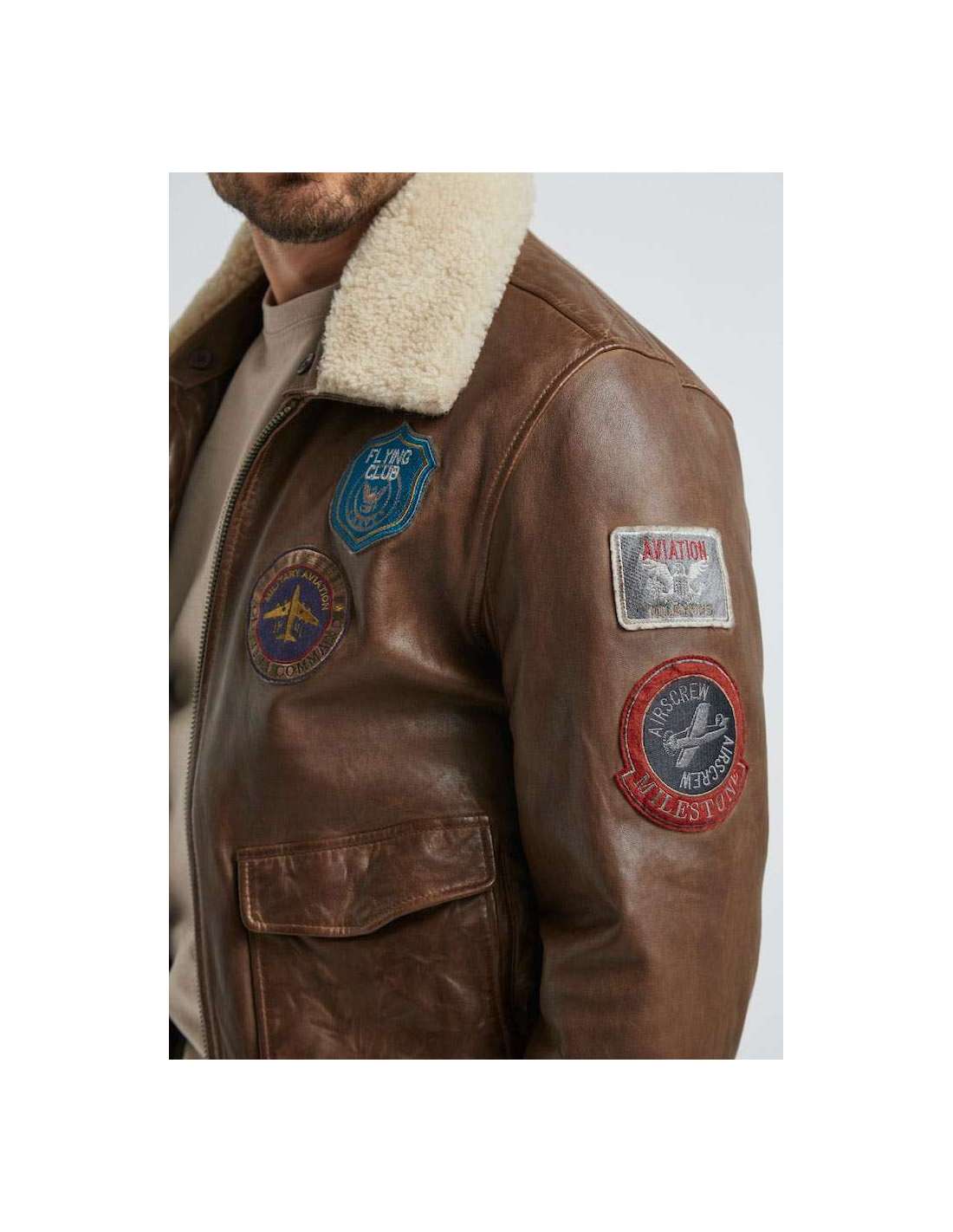 Composició: Pell d'origen oví Caçadora de cuir estil pilot amb punys i cintura acabats amb punt. Diversos pegats fan d'aquesta jaqueta un estil casual. El coll de pell de xai és desmuntable.