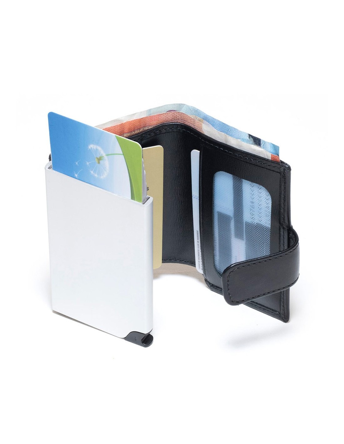 Dos departaments per a targetes o per document d'identitat, una amb reixeta transparent..