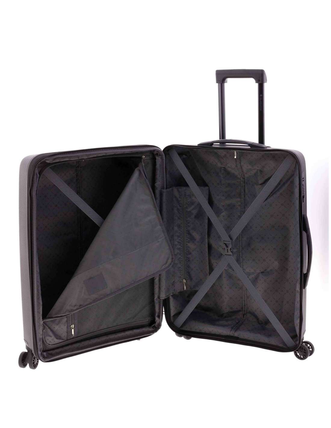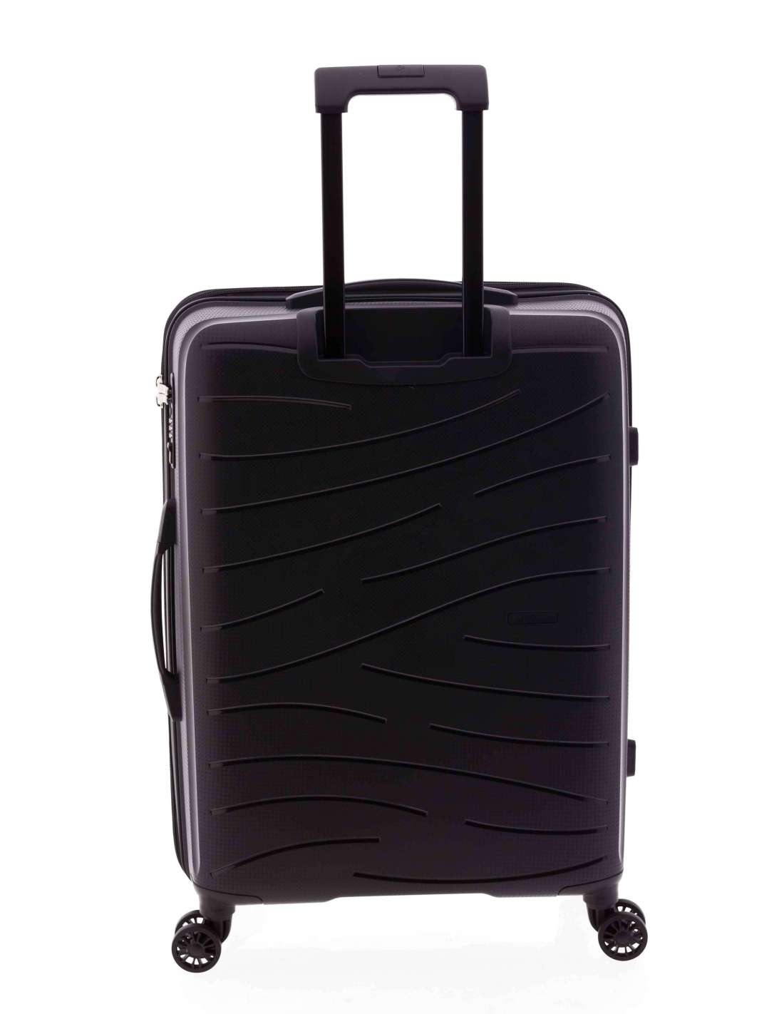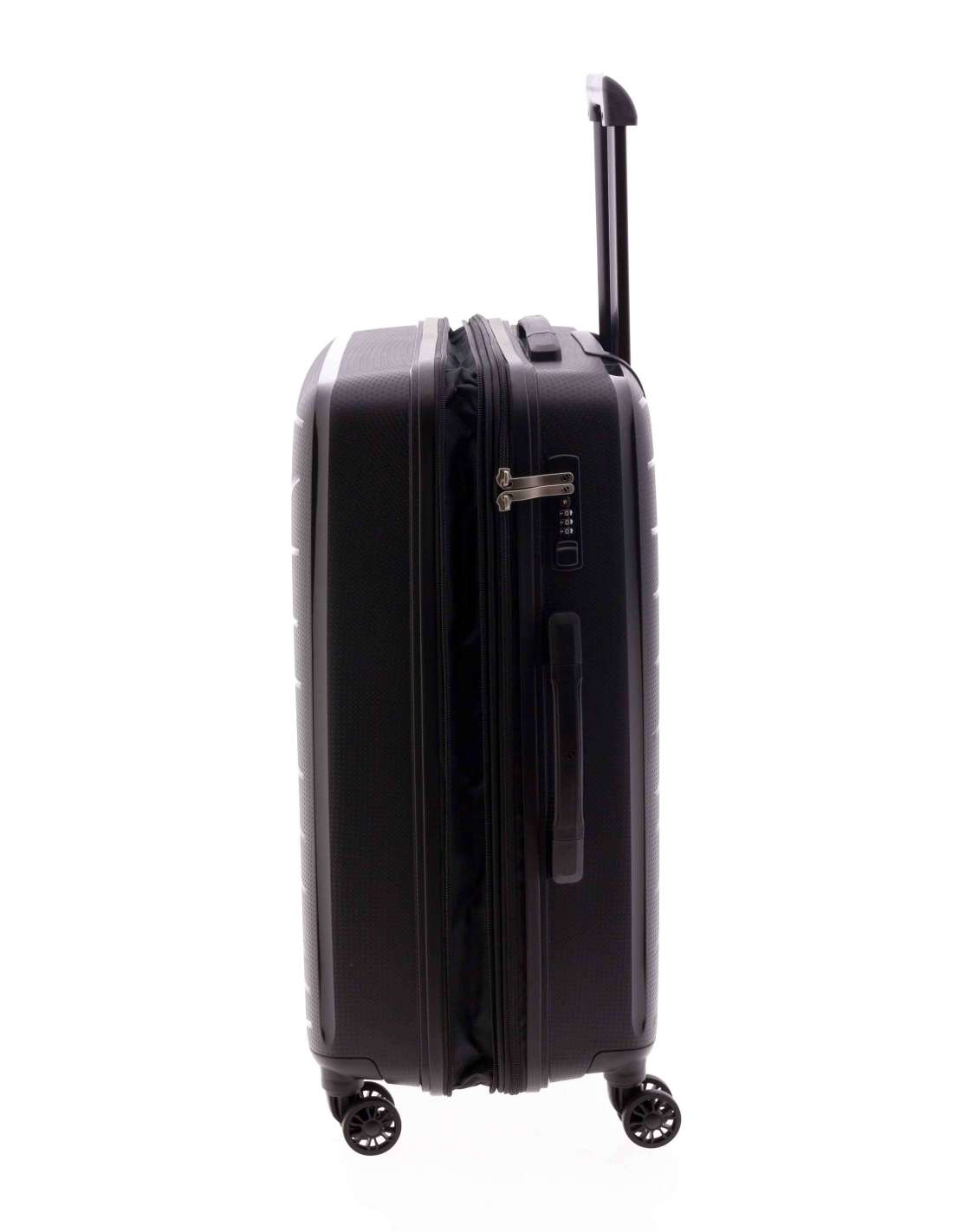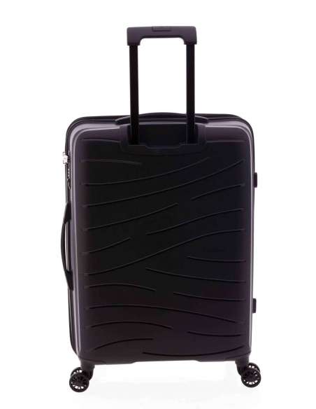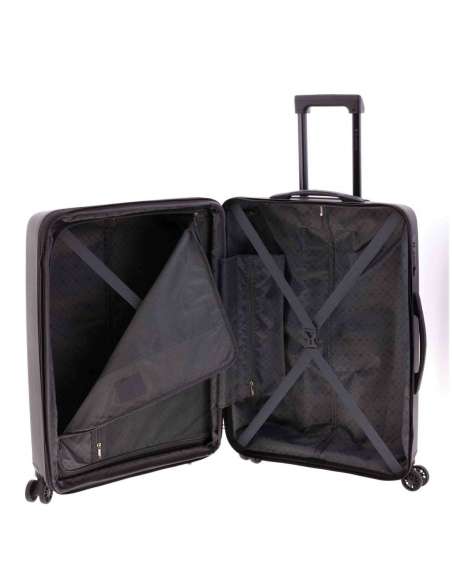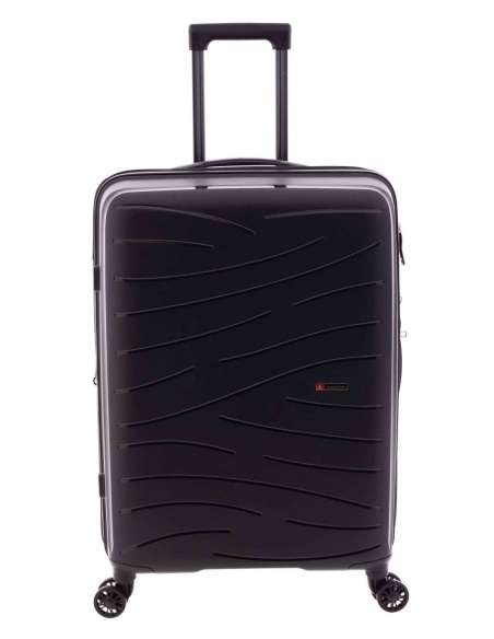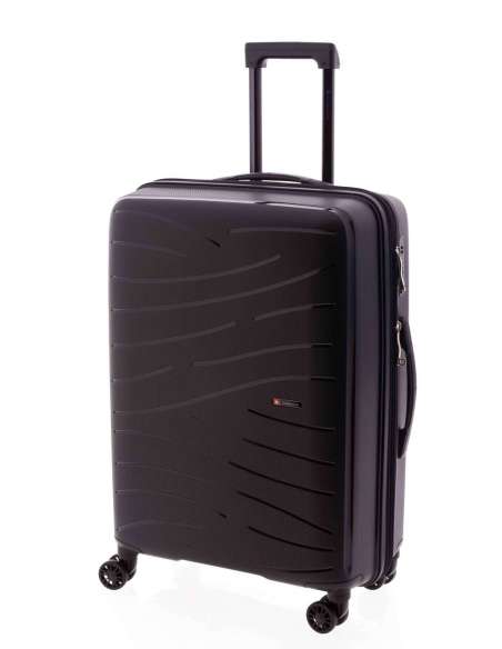 Maleta mitjana fabricada en material súper resistent polipropilè. Quatre rodes dobles. Cadenat de combinació incrustat al lateral. Nansa superior i lateral. Extensible. Mecanisme amb botó. Interior folrat amb butxaques. Cintes elàstiques a banda i banda.