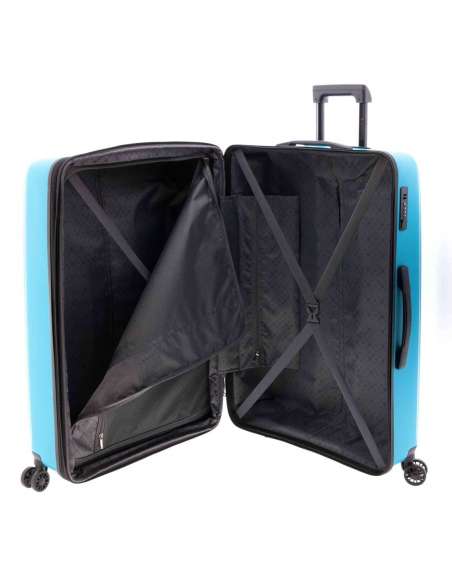 Maleta gran fabricada amb material súper resistent polipropilè. Quatre rodes dobles. Cadenat de combinació incrustat al lateral. Nansa superior i lateral.