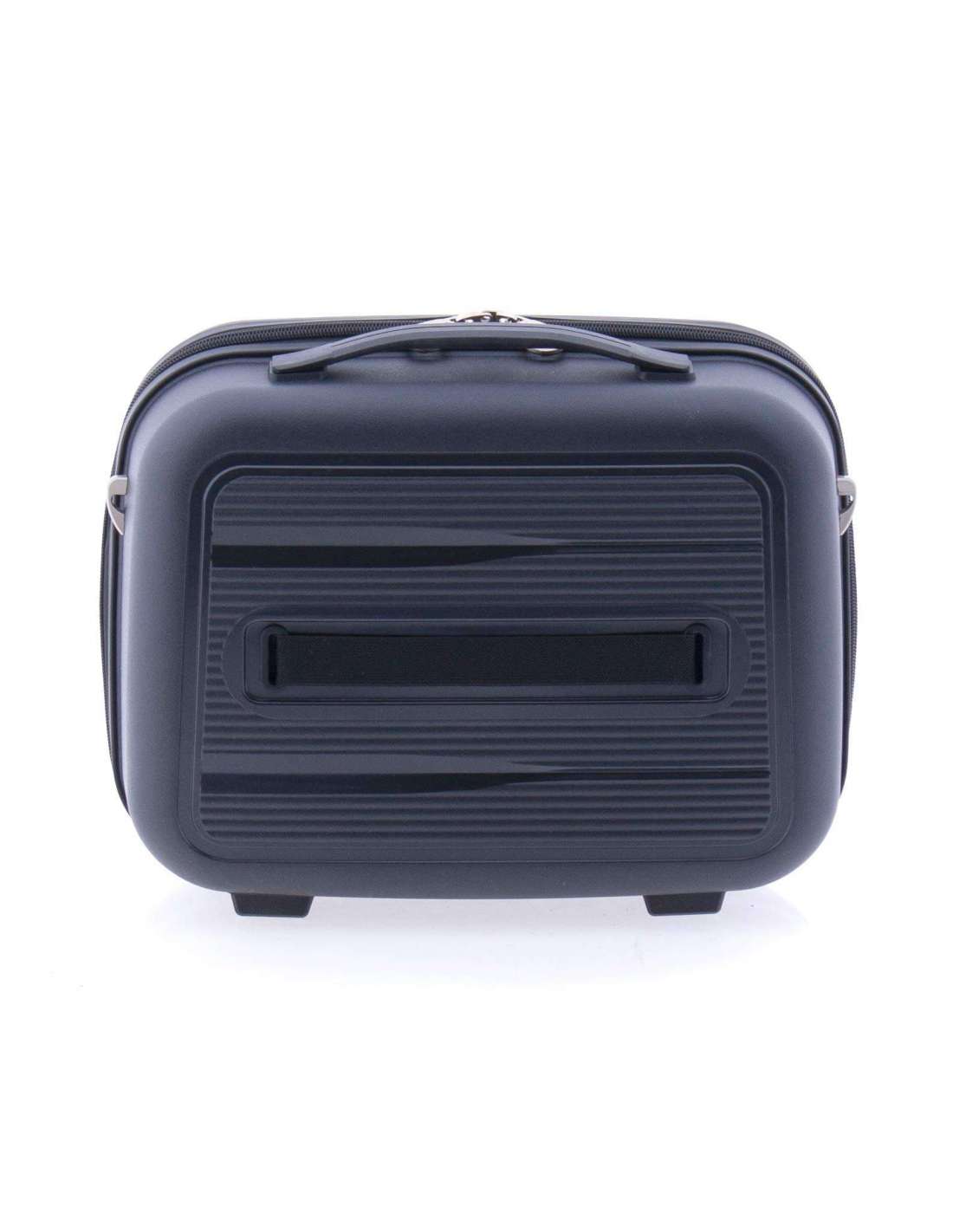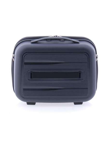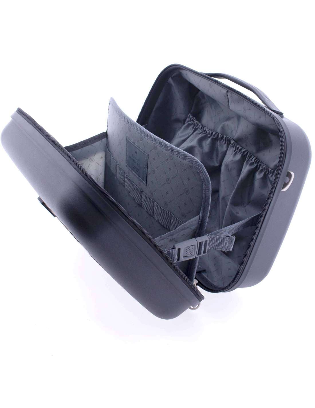 Necesser de viatge rígid Polipropilè. Nansa a la part superior. Bandolera regulable. Cinta a la part posterior per poder acoblar al mecanisme de la maleta. Mirall interior. Organitzador. Cinta per subjectar els pots. Safata separadora.