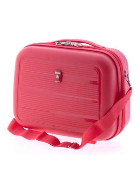 Necesser de viatge rígid Polipropilè. Nansa a la part superior. Bandolera regulable. Cinta a la part posterior per poder acoblar al mecanisme de la maleta. Mirall interior. Organitzador. Cinta per subjectar els pots. Safata separadora.