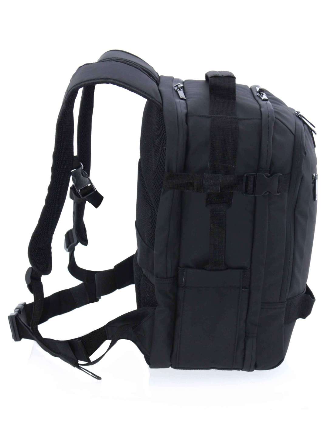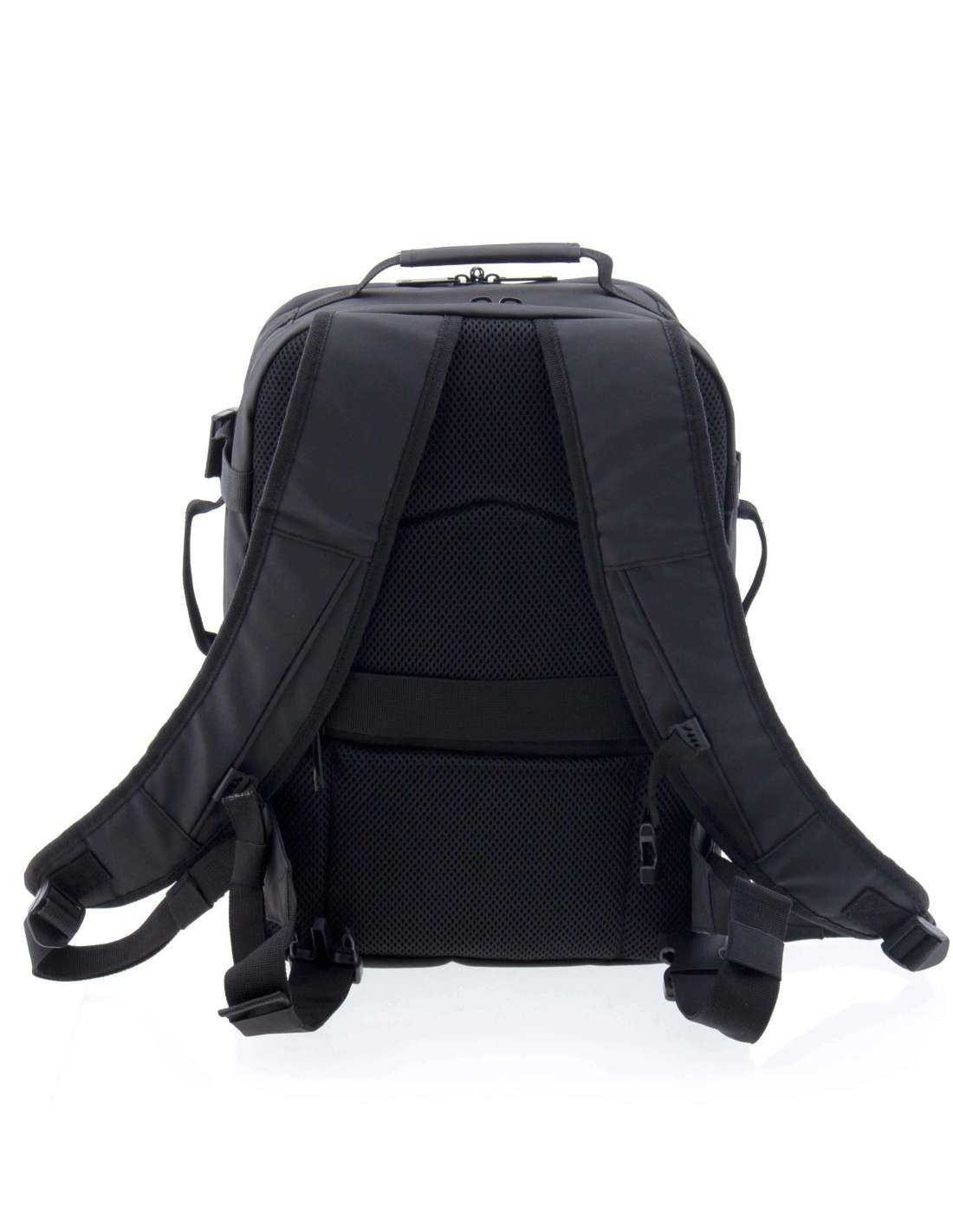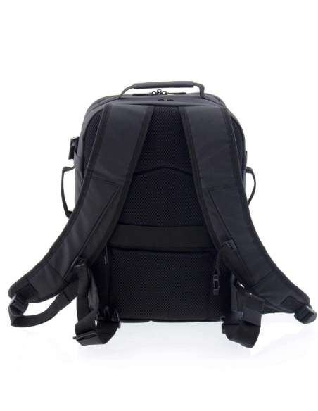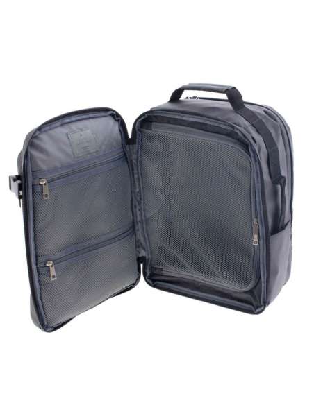 Motxilla de viatge amb mesures aptes sota el seient. Material Reversed polyester. Material i cremalleres repel·lents a l'aigua. Obertura tipus maleta. Compartiment encoixinat per a portàtil 14' i tablet. Organitzador i clauer interior. Butxaca del darrere.