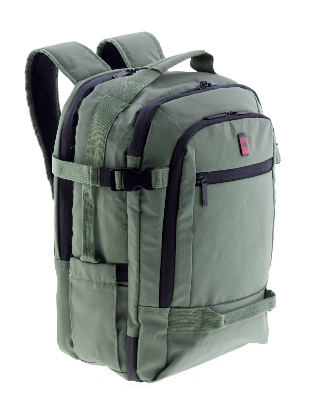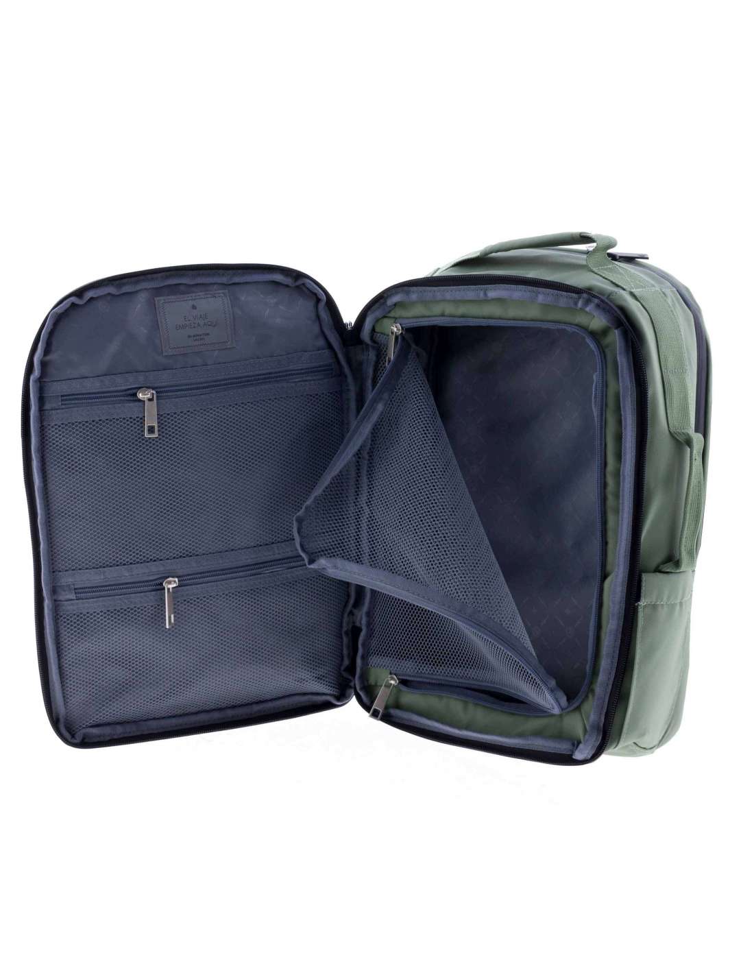 Motxilla de viatge amb mesures aptes sota el seient. Material Reversed polyester. Material i cremalleres repel·lents a l'aigua. Obertura tipus maleta. Compartiment encoixinat per a portàtil 14' i tablet. Organitzador i clauer interior. Butxaca del darrere.