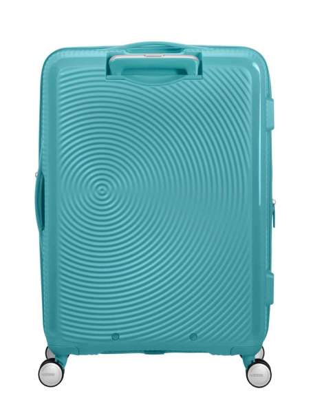 Maleta. La maleta expansible de mida mitjana Soundbox és una excel lent elecció per a una setmana de vacances. És segura, lleugera i resistent, i el divertit disseny circular amb superfícies esmaixades i brillants contrastades farà tornar les mirades a tot arreu on viatges. Expansibilitat, pany TSA fixa, quatre rodes de rodatge suau i pràctica organització interior són qualitats que ajudaran a convertir aquesta maleta en lelecció més valorada. Material de fabricació: 100% Polypropylene. Rígida. Dimensions: 67 x 46.5 x 29 cm. Dimensions expandides: 67 x 46,5 x 32 cm. Volum: 71.5 L. Volum expandit: 81 L. Pes: 3,7 kg. Cadenat fix de combinació de 3 dígits amb funció TSA. Cremalleres estàndard. 4 rodes. Rodes Dobles. Tirador de doble tub. Nansa(s) superior(s) & lateral (és). Compartiment superior. Separador intern en compartiment superior. Compartiment inferior amb cintes. En compartiment superior Garantia legal.