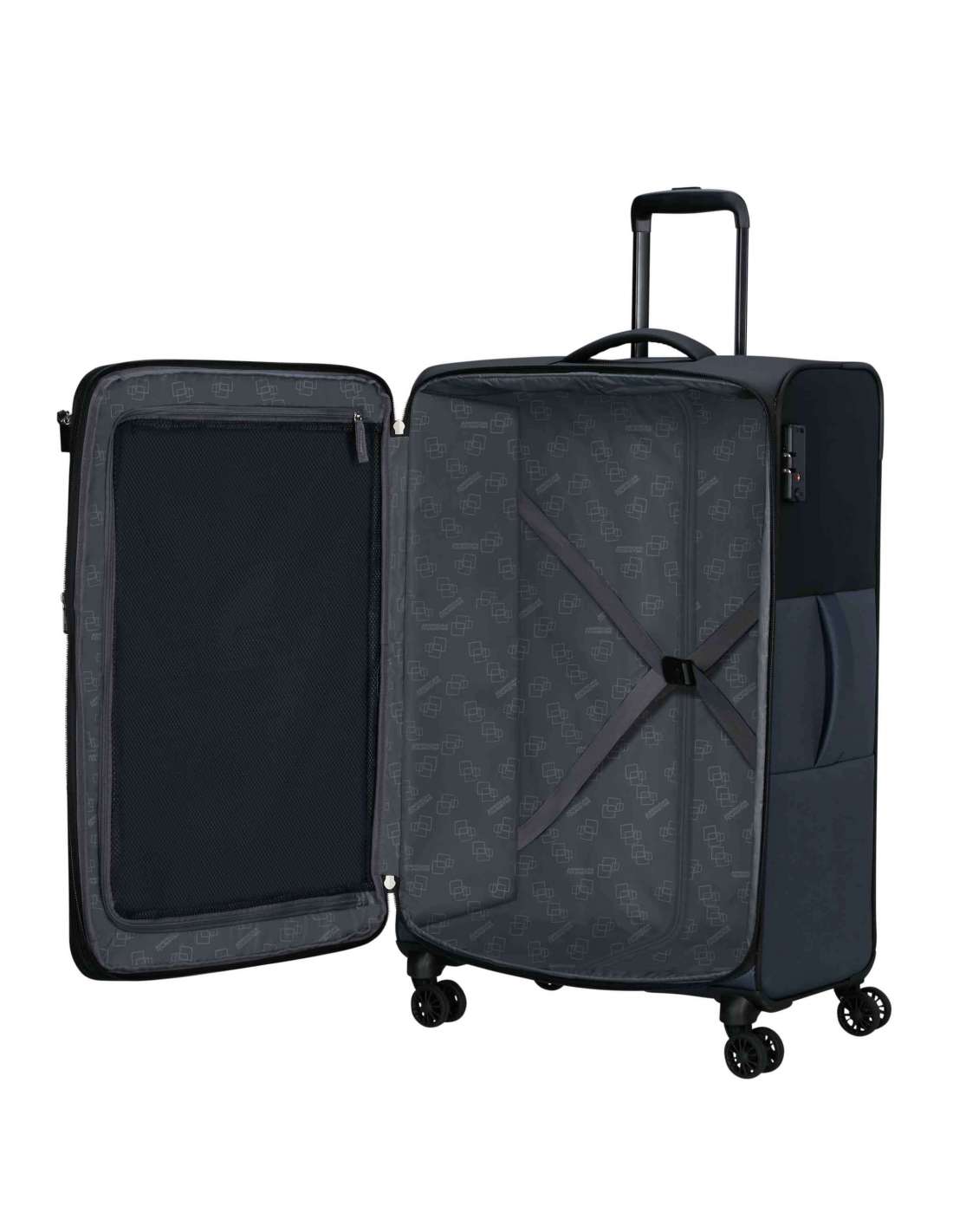 Maleta gran. Tova. Material de fabricació: polièster i recyclex. Dimensions: 77 x 50 x 30 cm. Dimensions expandida: 77 x 50 x 35 cm. Pes: 3,7 kg. Volum: 107 litres. Volum expandida: 117 litres. Tancament amb pany TSA de 3 dígits. Nanses superior i lateral. Tirador de doble tub. 4 rodes dobles. 1 butxaca exterior davanter. Compartiment central amb cintes creuades. Garantia legal