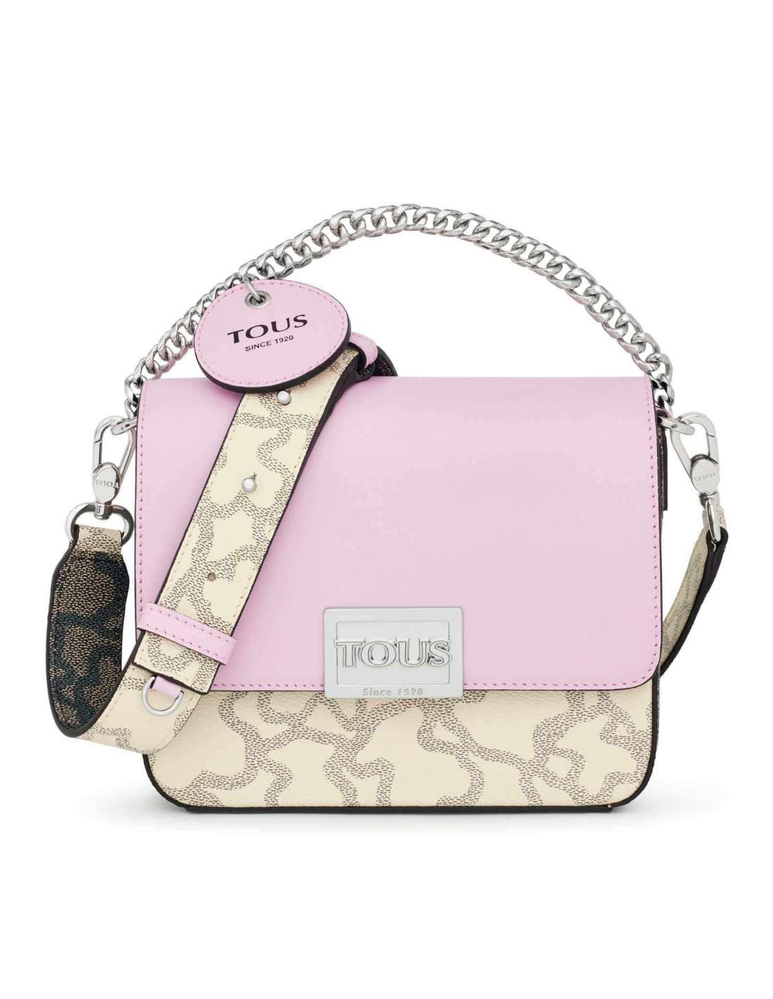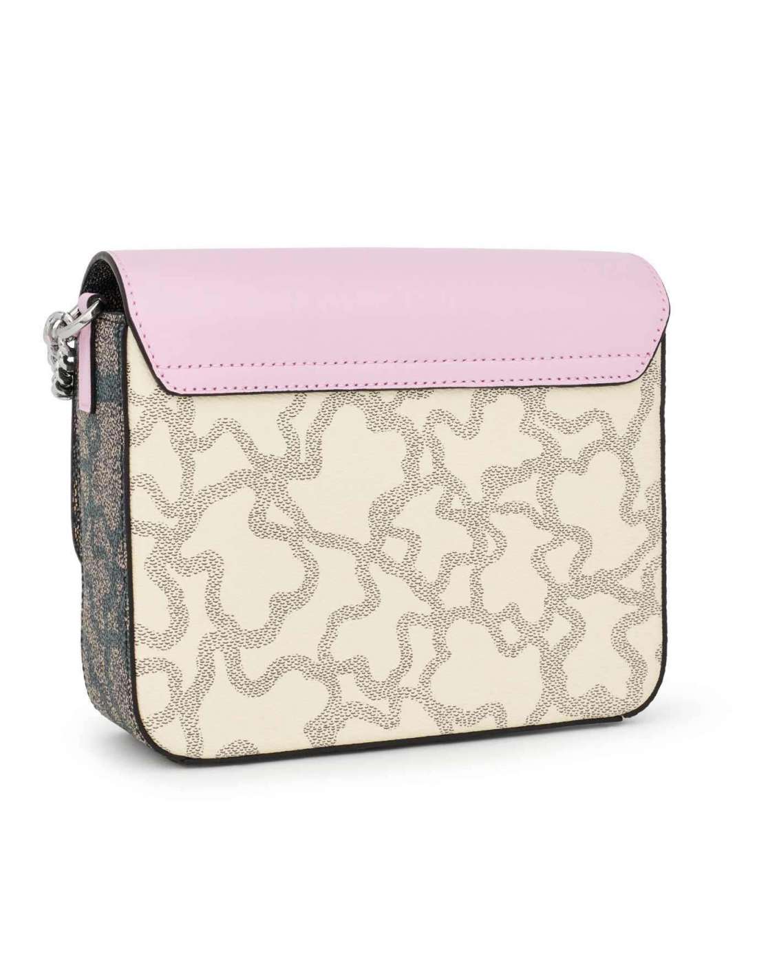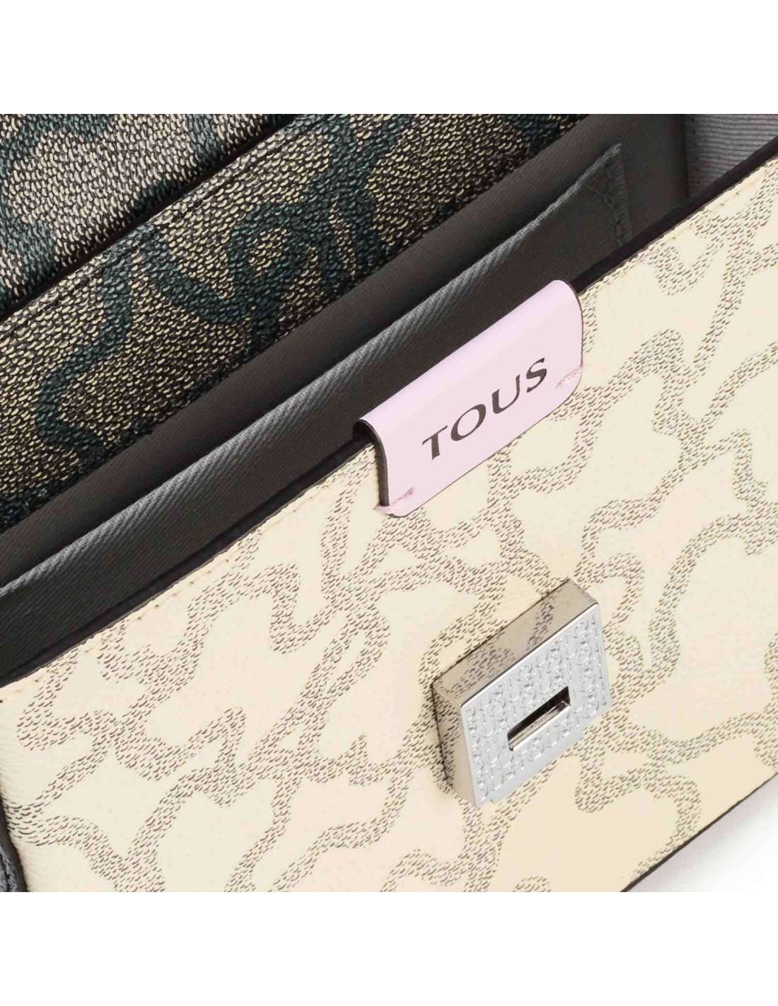 Bolso bandolera pequeño TOUS Kaos Legacy de lona con estampado Kaos. Viene con solapa y el cierre es a presión. El asa de mano es de cadena metálica e incluye un asa de bandolera ajustable y extraíble. Cuenta con un bolsillo interior abierto para tarjetas.