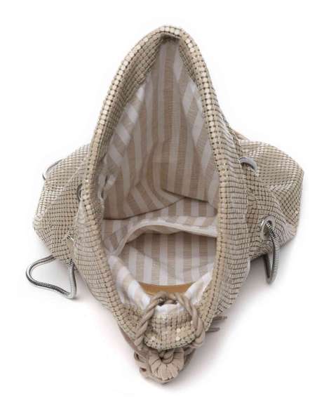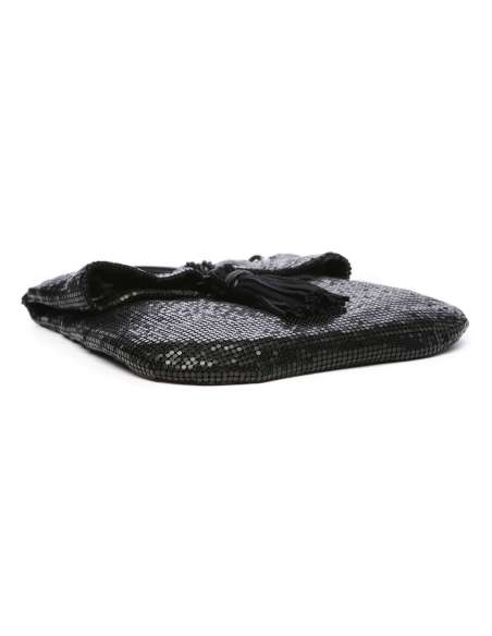 Elaborado con malla metálica. Asa metálica corredera (puede usarse como asa bandolera o asa de hombro). Solapa y detalle borla de serraje. Bolsillo interior con cremallera.