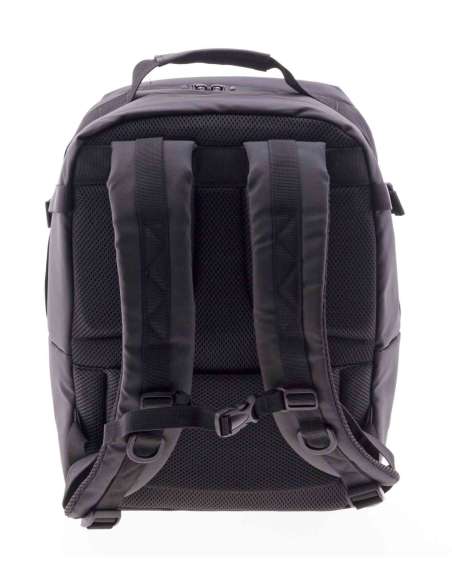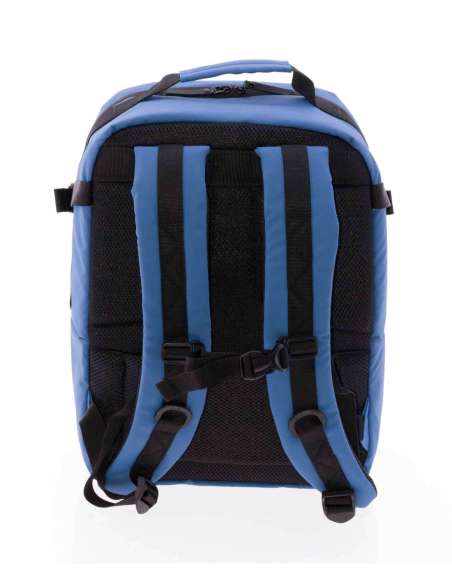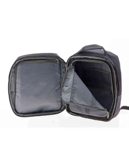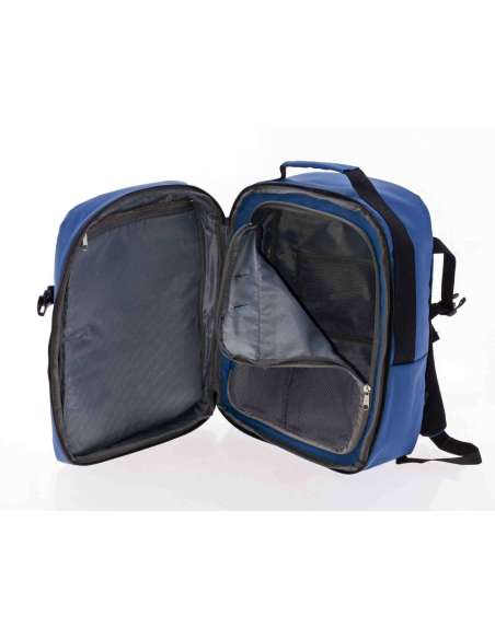 Material repelente al agua. Medidas aptas como equipaje de mano. Apertura de la mochila como una maleta. Asa superior. Varios bolsillos exteriores. Compartimento para ropa. Dpt. Para el portátil de 14". Cinta posterior para poder acoplar al mecanismo de la maleta.