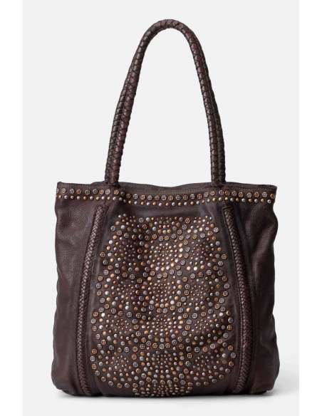 Shopper de piel vacuna lavada, y de curtición vegetal. Compleja técnica de trenzado a mano y aplicación de tachuelas. Cierre con cremallera, bolsillos externos e internos, y forro de algodón.