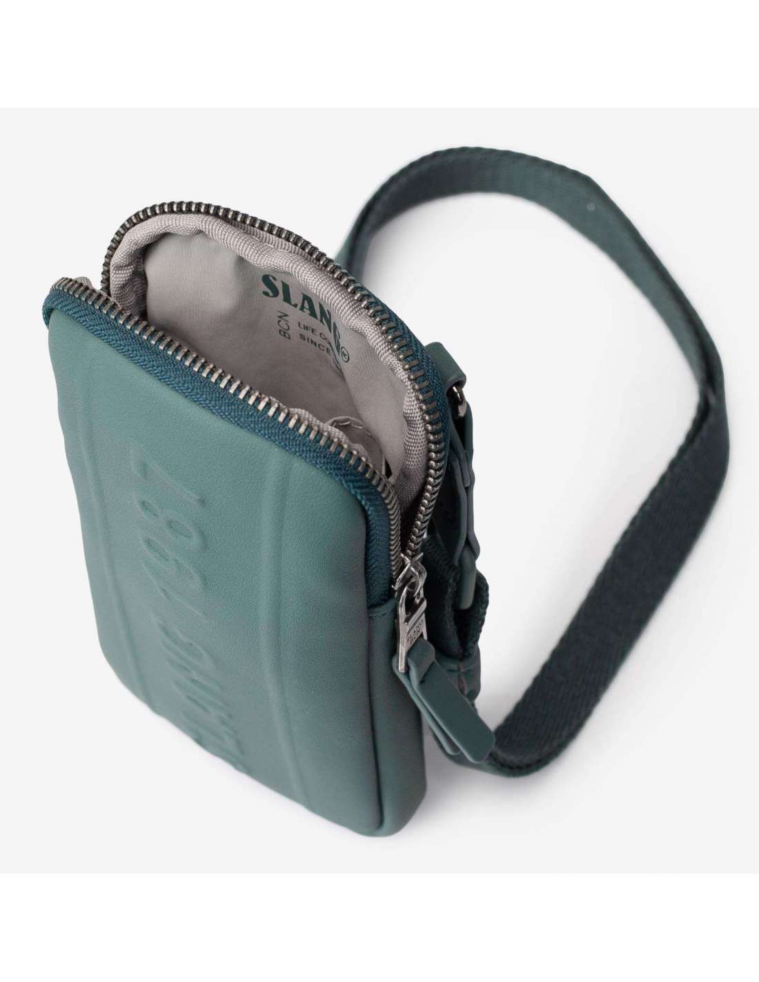 Phone Pouch con material reciclado de tacto suave y liso. Correa regulable. Forro interior de poliéster con bolsillos. Cierre de cremallera metálica.