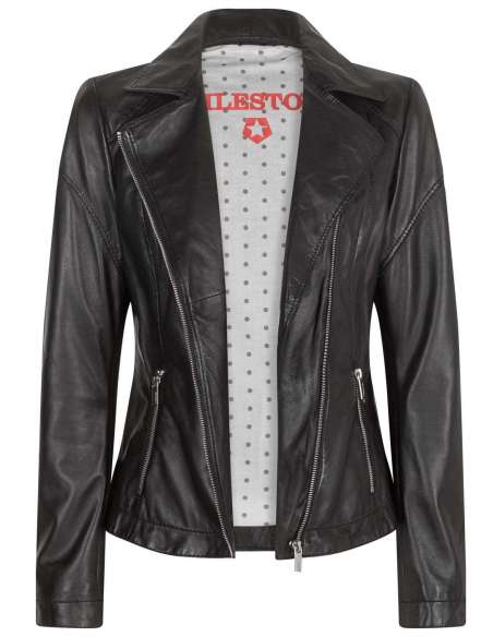 Cazadora de cuero natural tipo perfecto cruzada de piel muy suave y ligera.