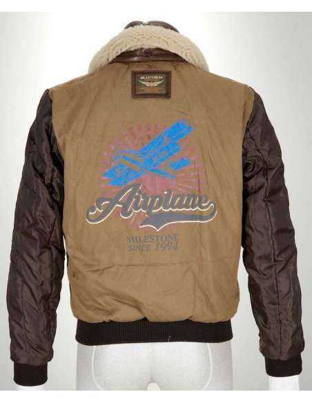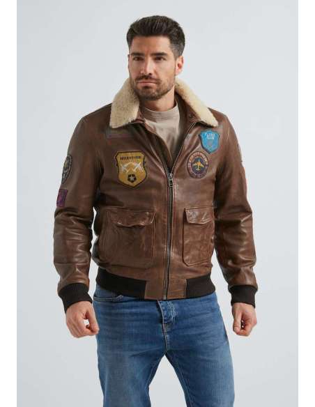 Cazadora de cuero estilo piloto con puños y cintura acabados en punto. Varios parches hacen de esta chaqueta un estilo casual. El cuello de piel de cordero es desmontable.