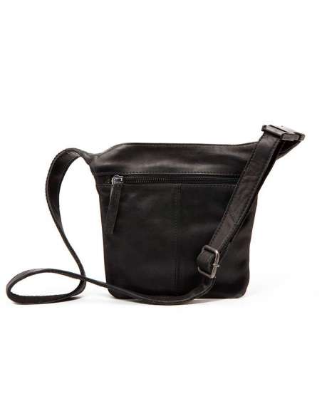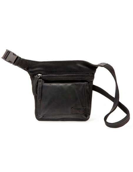 Riñonera fabricada en piel lavada de primera calidad. En la parte delantera dispone de dos bolsillos con cremallera, el superior da acceso al compartimento principal. Dispone de un bolsillo más en la parte posterior. Estilo urbano. Bandolera de piel regulable y cremalleras a tono. Herrajes metálicos en zamak, cierre de la bandolera en PVC. Forro de algodón.