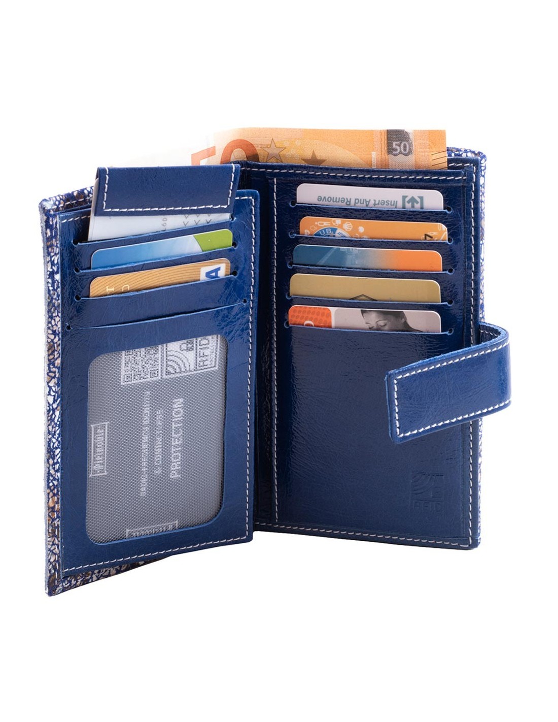 Nueve departamentos para tarjetas, uno con rejilla transparente y uno con funda para documento de identidad.