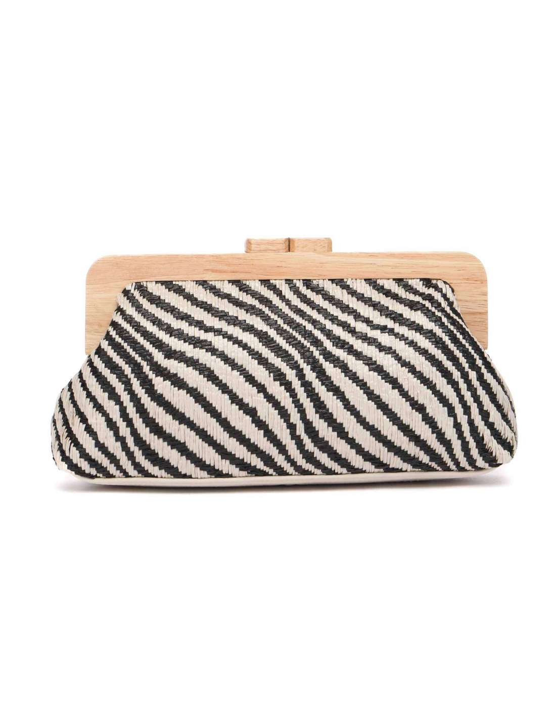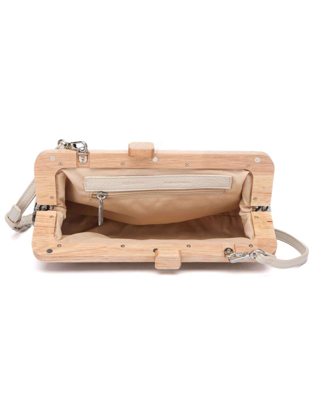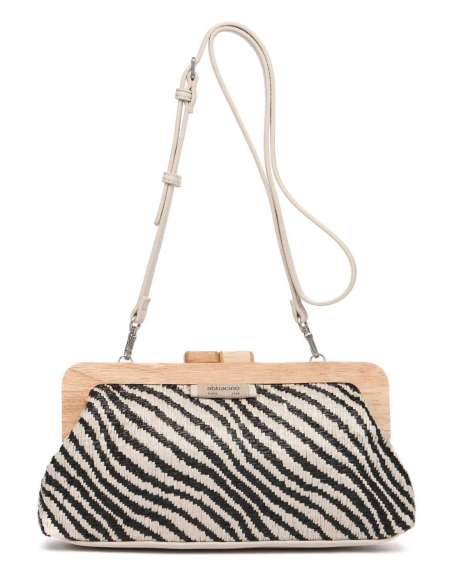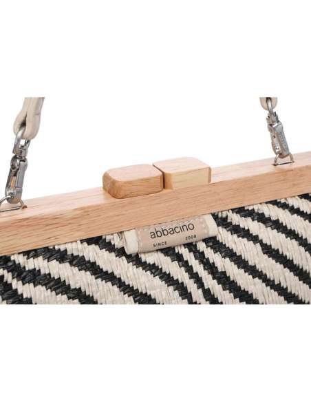 Elaborado en tejido trenzado y madera. Forro interior. Su interior cuenta con un pequeño compartimento organizador. Dispone de cierre con boquilla. Incluye un asa bandolera de cadena.
