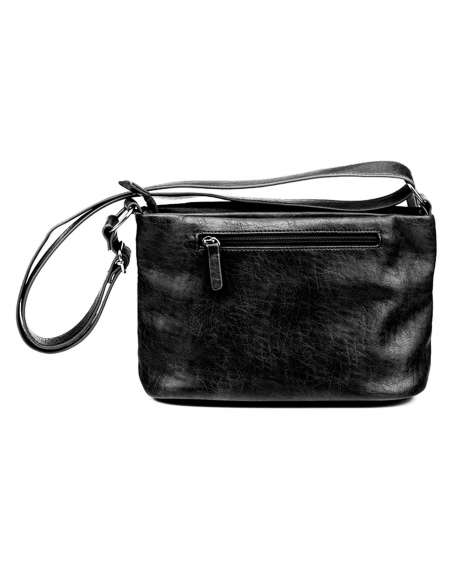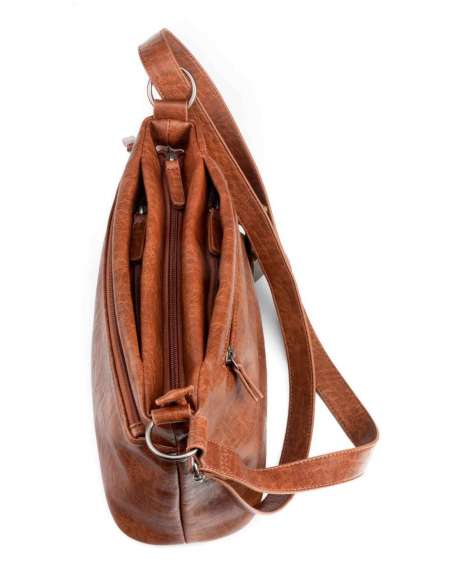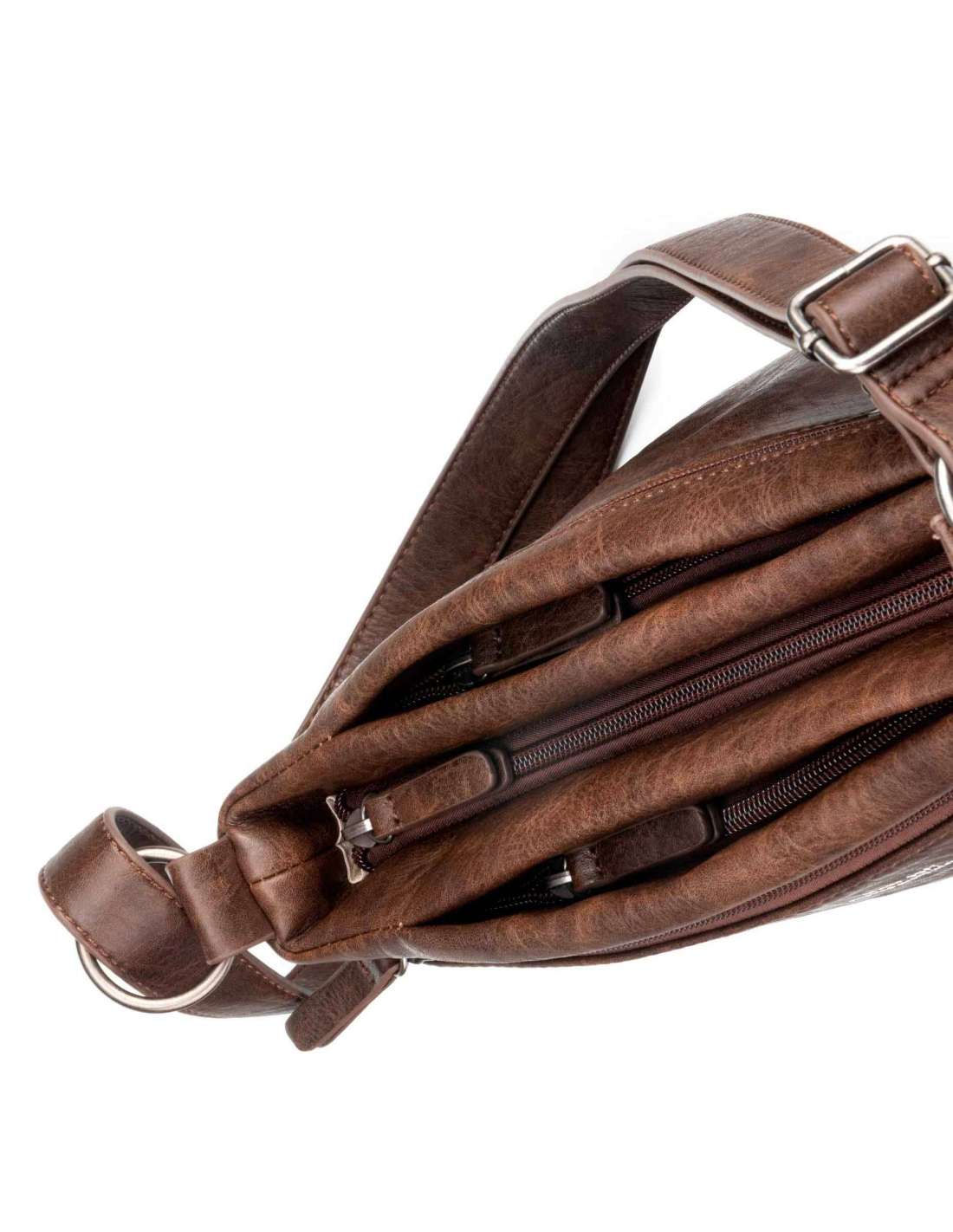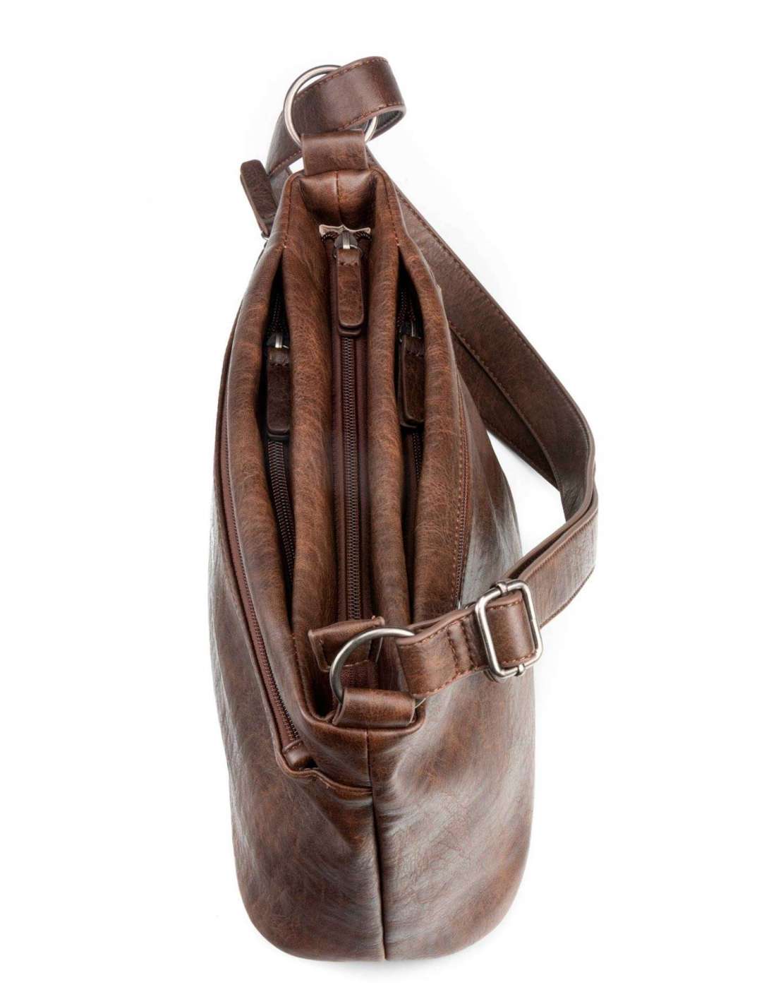Bolso bandolera fabricado en ecopiel y con bandolera regulable, para llevar al hombro o cruzado. Dispone de bolsillo exterior con cremallera tanto en la parte frontal como en la parte trasera, así como de dos bolsillos más pegados al departamento principal. Herrajes metálicos en zamak. Forro de algodón. Colección Aquila