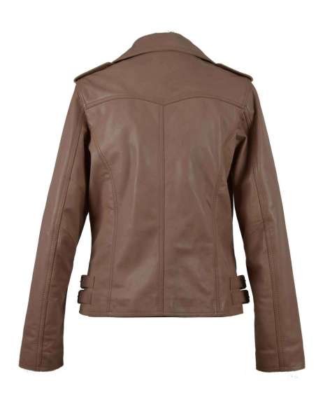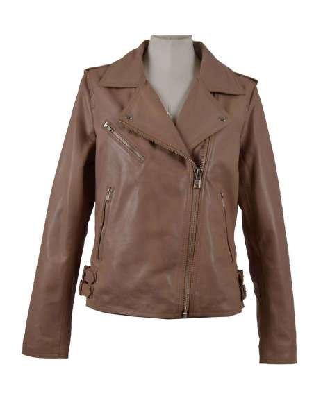 Biker de cuero natural. Se abrocha con cremallera. Bolsillos cerrados con cremallera. En el lateral de la cintura tiene dos cinturones con hebilla para poder entallar más. Forro fino. Largo de la prenda 58 cm(tall XL).