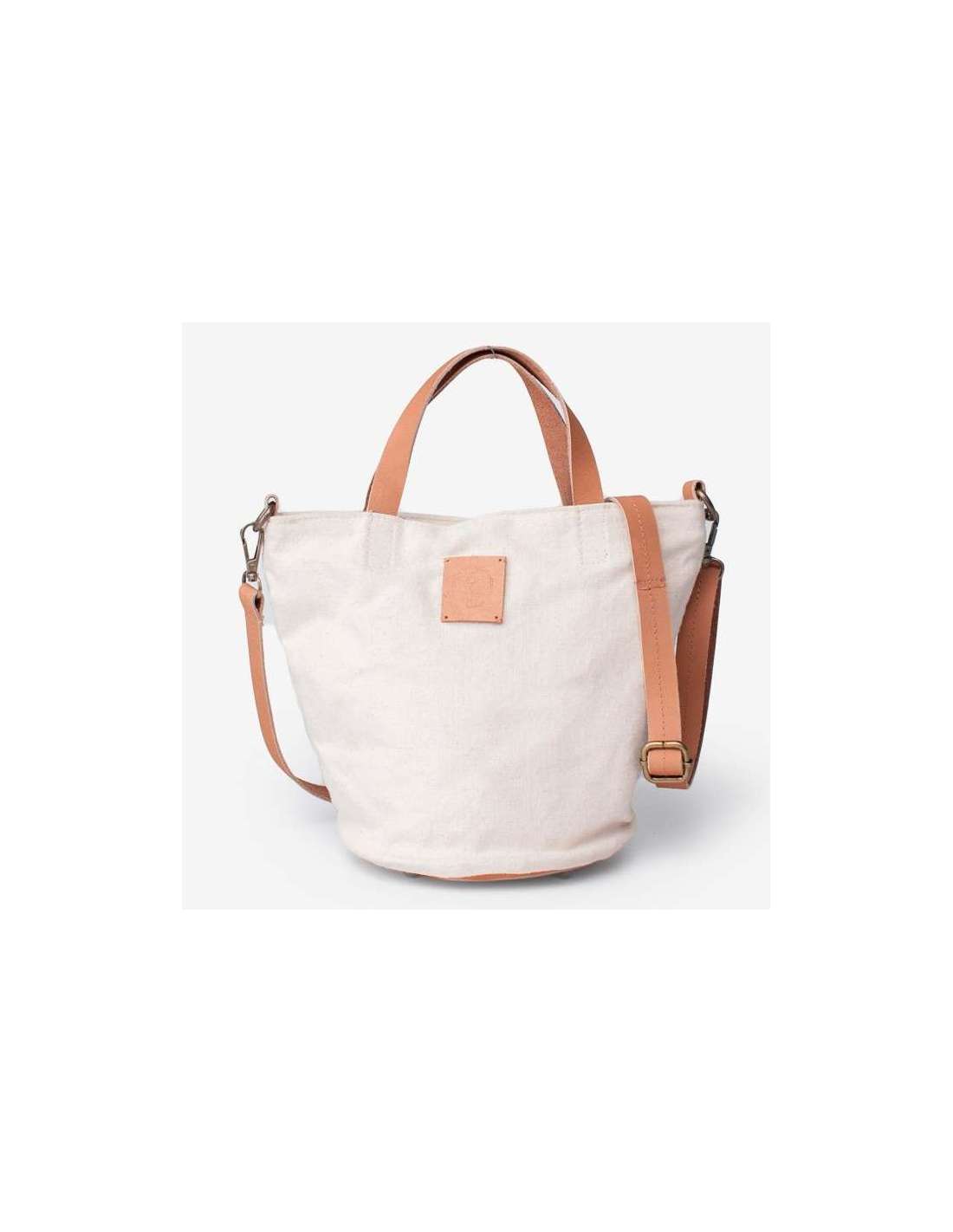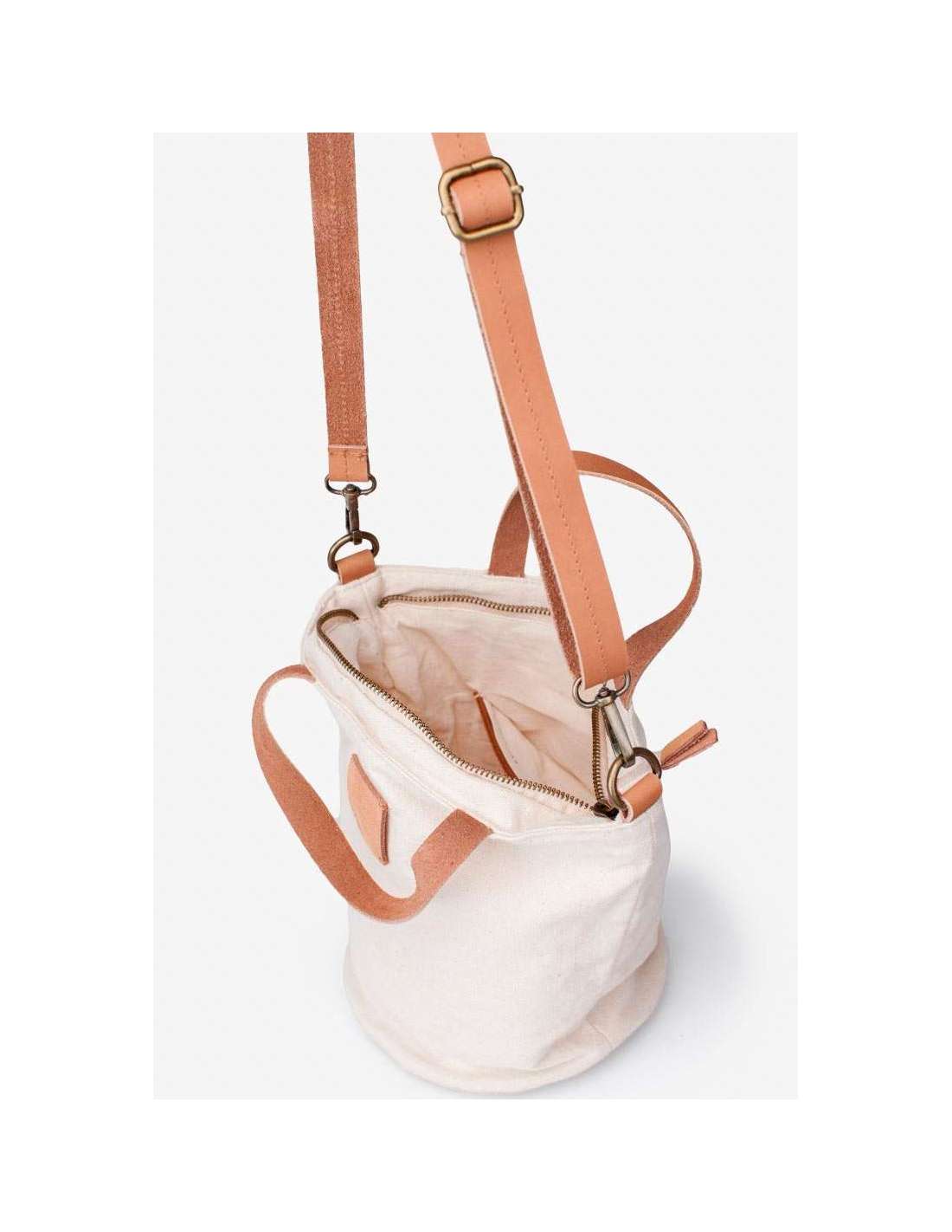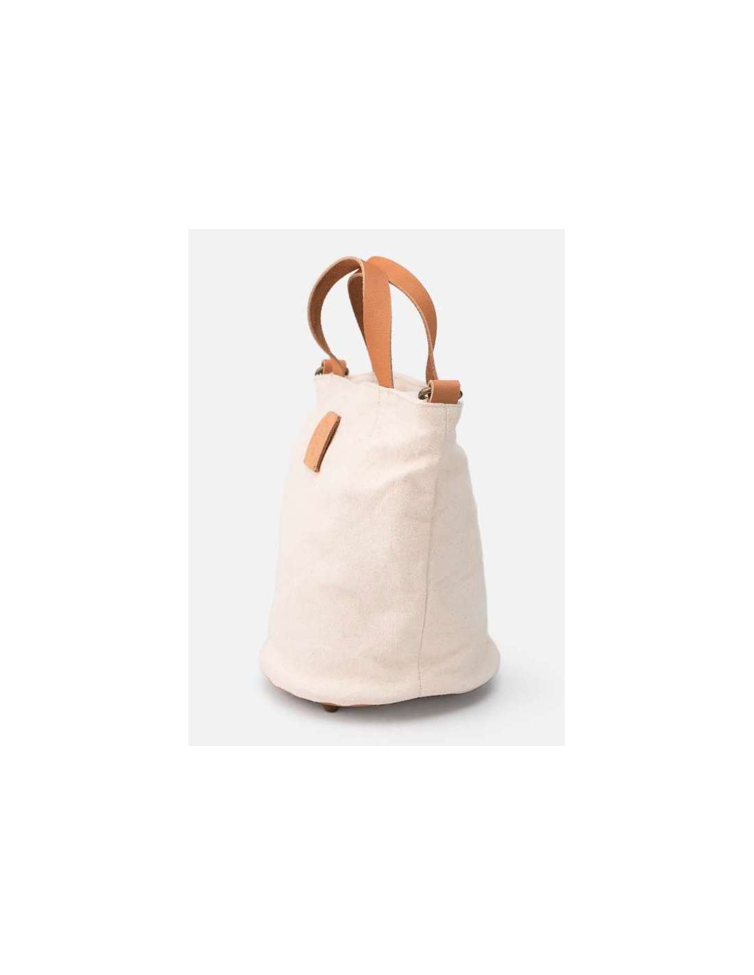 Mini bandolera de algodón reciclado con base circular en piel con soportes metálicos. Asas de mano y bandolera de piel, ésta última regulable y extraíble, bolsillos internos, y forro de algodón.