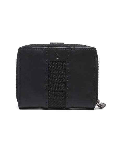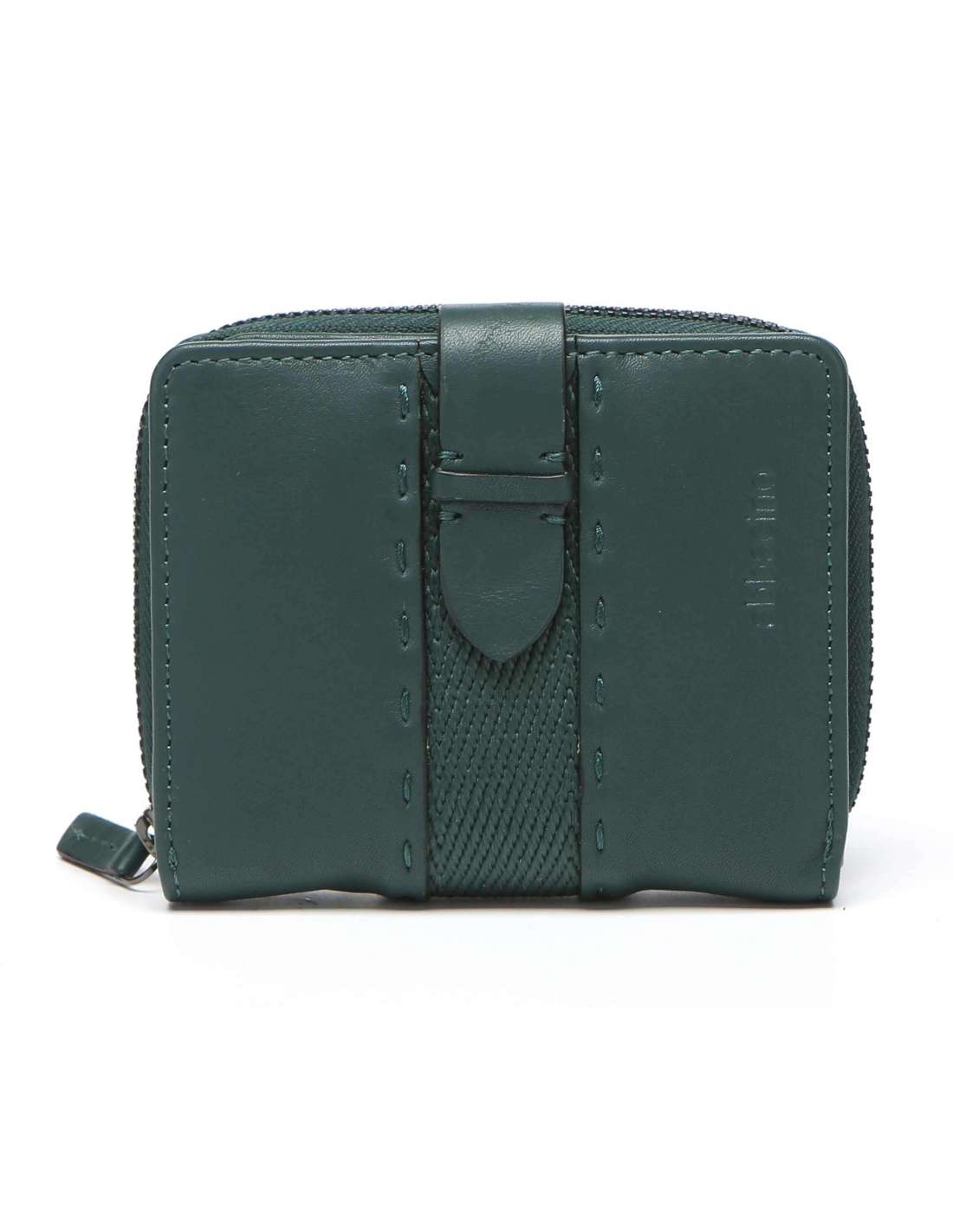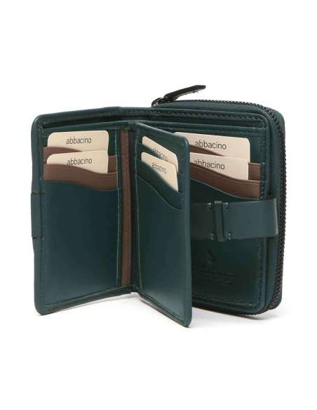 Elaborada con piel. En su interior cuenta con diversas ranuras para las tarjetas (una especial para DNI) y un compartimento para billetes. Cuenta con un compartimento exterior que cumple la función de monedero. Incluye un tarjetero extraíble. Logo Abbacino grabado en su parte frontal. Tamaño pequeño.