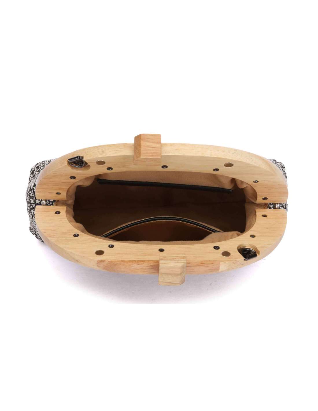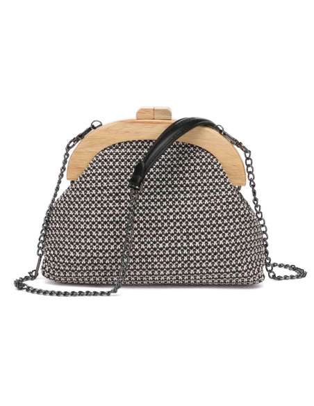 Bolso de mano realizado en una bonita combinación trenzada y madera. Este modelo destaca por su elegancia y su estilo sofisticado, ideal para acompañarte en eventos especiales.