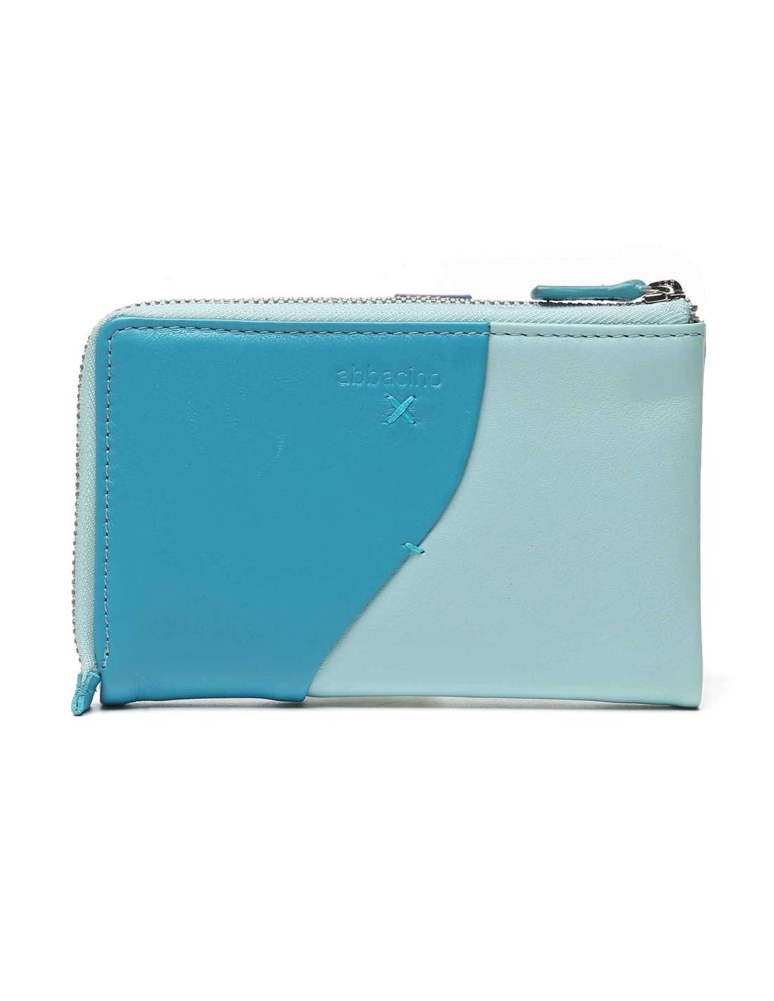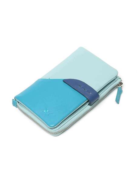 Cartera mediana de mujer elaborada en piel que combina diversas tonalidades de color. Un modelo en el que destaca una tira de piel curva en un tono más oscuro que atraviesa la parte frontal de la cartera, añadiendo un toque de contraste y originalidad al diseño.