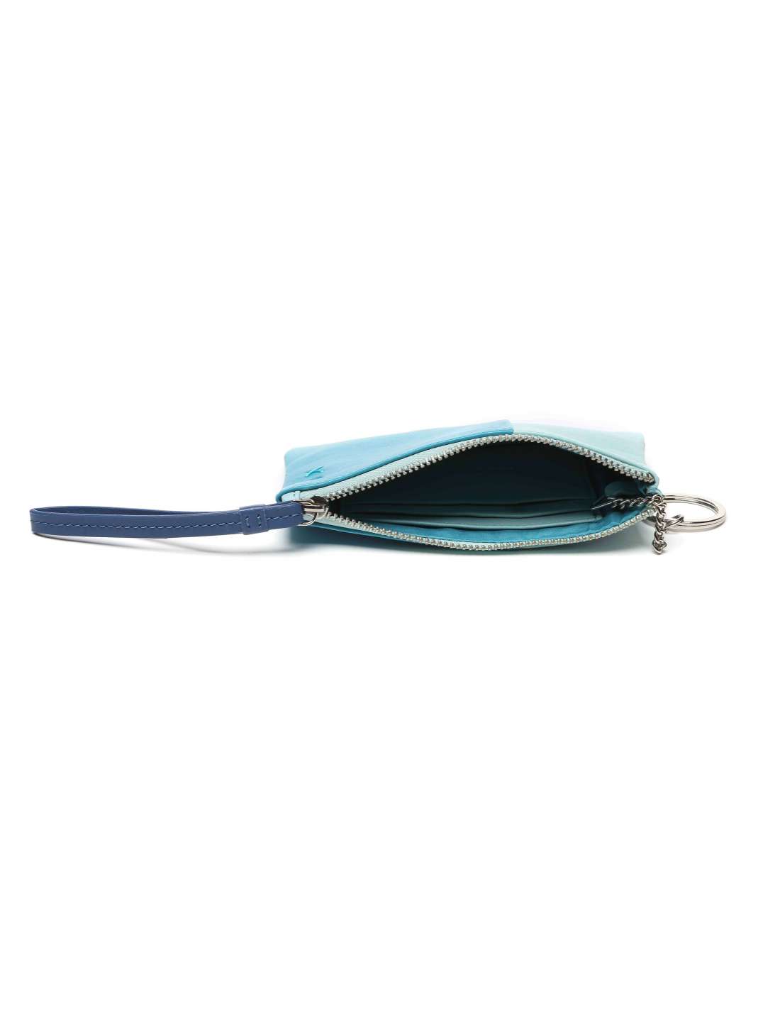Monedero de mujer elaborado en piel que combina diversas tonalidades de color. Un modelo en el que destaca una tira de piel curva en un tono más oscuro que atraviesa la parte frontal de la cartera, añadiendo un toque de contraste y originalidad al diseño.