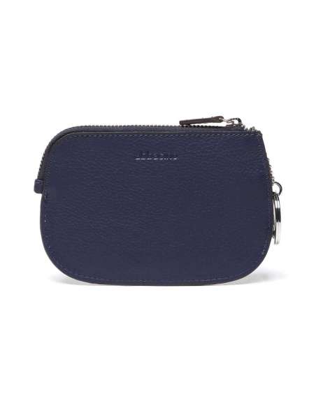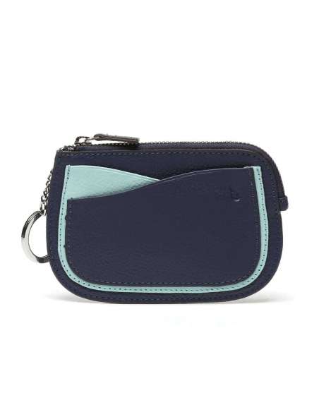 Monedero de mujer elaborado en piel sobre la que destaca una fina franja curva que combina con el tono principal del complemento. Sus colores vivos y refrescantes son perfectos para los días de verano.