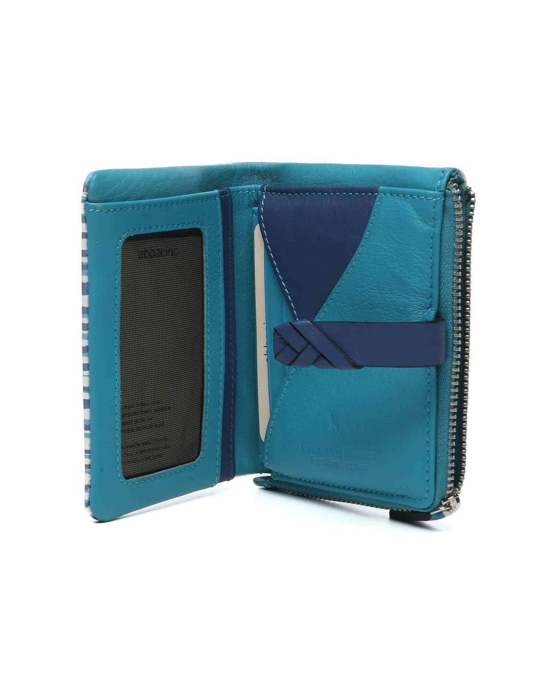 Cartera pequeña de mujer elaborada con piel. Un diseño con un bonito estampado a rayas, en tonos frescos y vivos. Se trata de un complemento que cuida hasta el mínimo detalle y que gracias a su distribución nos permite conseguir un orden excelente.