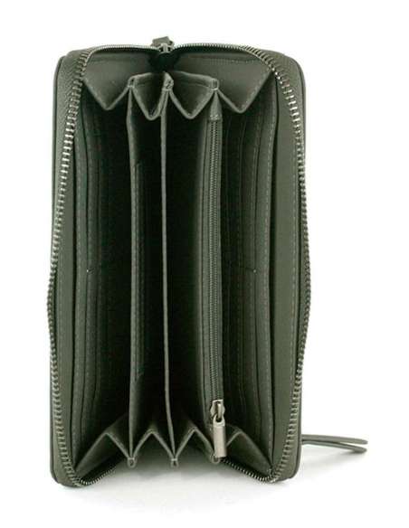 Billetero de mujer fabricado en ecopiel impermeable, tamaño grande. Cierre con cremallera perimetral. En su interior, organizado en 4 apartados, hay capacidad para 16 tarjetas y espacio para los billetes. Además dispone de un portamonedas interior con cierre de cremallera, así como de un bolsillo exterior también con cremallera. Herrajes en zamak. Forro de algodón. Colección Impa