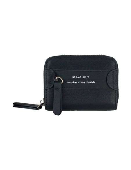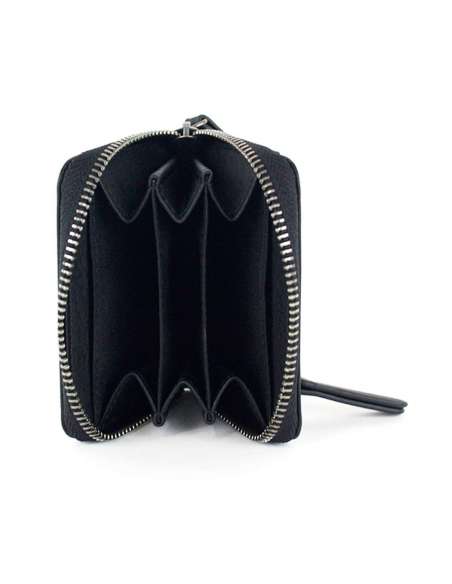 Portamonedas de mujer fabricado en ecopiel impermeable, tamaño compacto. Cierre con cremallera perimetral. En su interior, organizado en 3 apartados, hay capacidad para 2 tarjetas y espacio para las monedas. Dispone además de un bolsillo exterior también con cremallera. Herrajes en zamak. Forro de algodón. Colección Impa