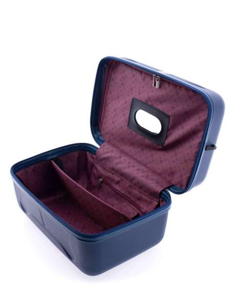 Neceser de viaje rígido ABS. Apertura superior. Cinta de sujeción para botes. Espejo interior. Asa en la parte superior para agarrar. Organizador interior con bolsillo de cremallera. Bandolera regulable. Cinta posterior para poder acoplar al mecanismo de la maleta.